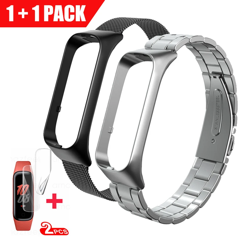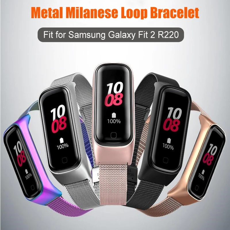 Ремешок для samsung galaxy fit 2 Сменные аксессуары. Материал: металлическая нержавеющая сталь Стиль: Миланская петля, Классический ремешок с пряжкой Цвет: серебристый, черный, розовое золото, розовый, цвет насыщенный. Характеристика: 1. Прочная конструкция магнита, без винта в сборе. Удобнее в использовании. 2. Нержавеющая сталь, без винтов 3. Портативный браслет для samsung galaxy fit 2 r220 smart band. 4. Хорошая альтернатива цветным браслетам 5. Легко установить 6. Удобно носить. Посылка включает: Металлический ремешок-1 шт. 2 х Защитные пленки из ТПУ