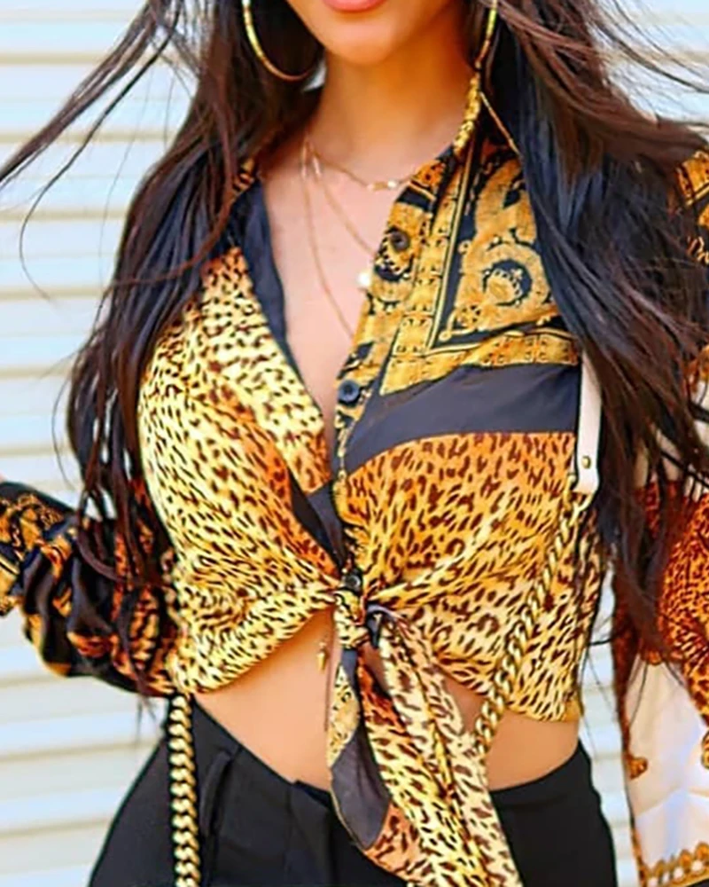 Женская Свободная блузка на пуговицах, элегантная Праздничная блузка с отложным воротником и леопардовым принтом, блузка с длинным рукавом и узлом спереди, осень 2022