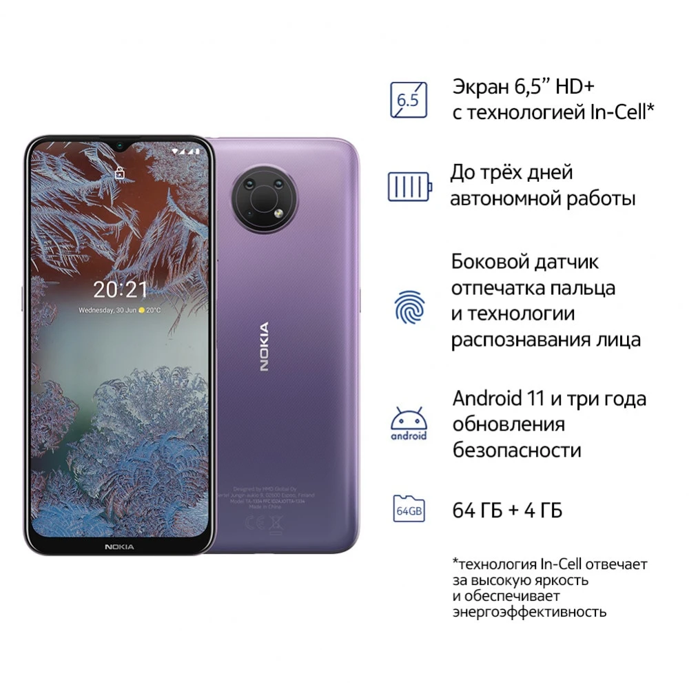 Смартфон Nokia G10 можно заряжать один раз в несколько дней. Большой экран займет ваших детей в течение всей поездки. Основная камера с улучшенными настройками всегда под рукой для съемки лучших моментов в жизни вашей семьи. Новейшие функции Android™ 11, два года обновлений операционной системы и три года обновлений для системы безопасности —ваш смартфон не потеряет актуальности со временем. Большой экран Nokia G10 с возможностью увеличения яркости позволяет смотреть фильмы и пользоваться любыми приложениями даже в солнечный день. Тройная камера Nokia G10 всегда под рукой для съемки главных моментов в жизни — от школьной пьесы до семейного торжества. Лаконичный и стильный скандинавский дизайн. Современные технологии и легкий прочный корпус двух цветов на выбор — грозовое небо и лавандовый. Благодаря ежемесячным обновлениям для системы безопасности в течение трех лет ваши видео, фотографии и данные надежно защищены. В Android 11 появились новые возможности для комфортного общения —сообщения из разных мессенджеров собираются в одной вкладке. Две новых версии операционной системы и доступ ко всем современным функциям.
