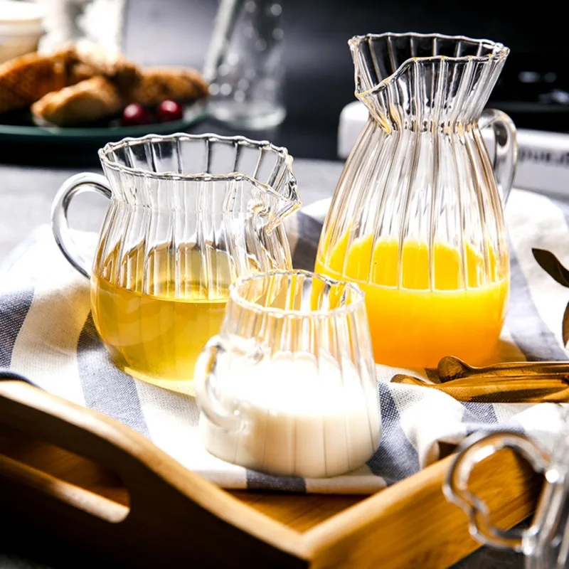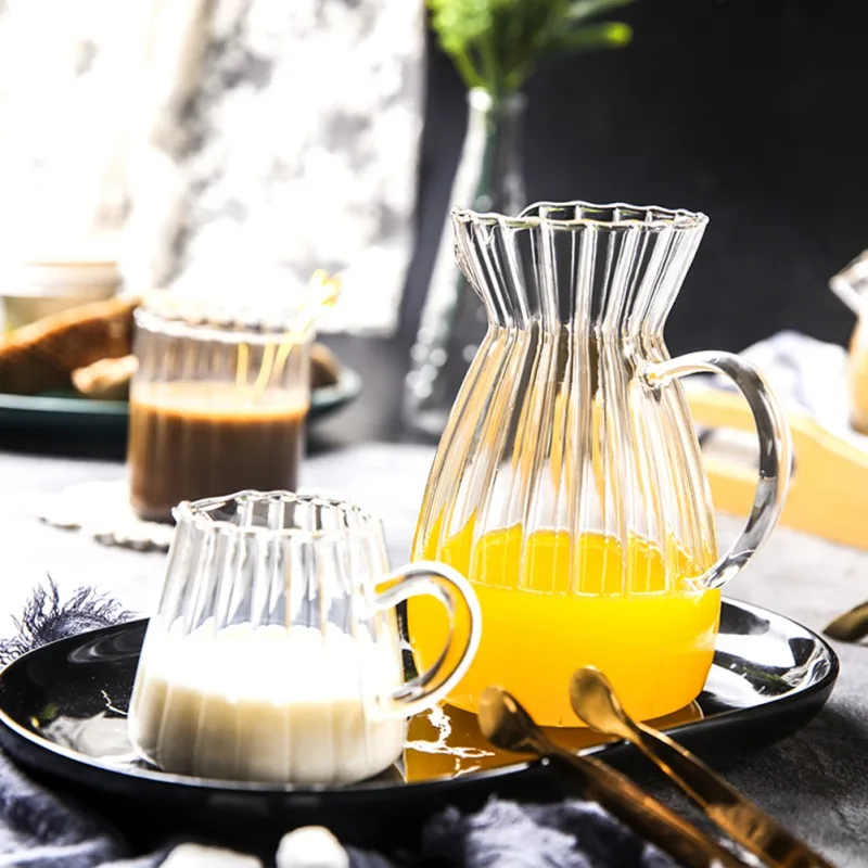 Японский стеклянный молочный кувшин в полоску с ручкой, термостойка...