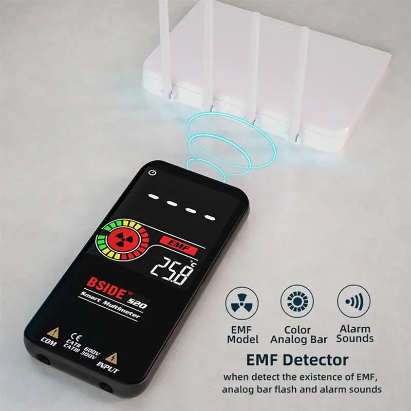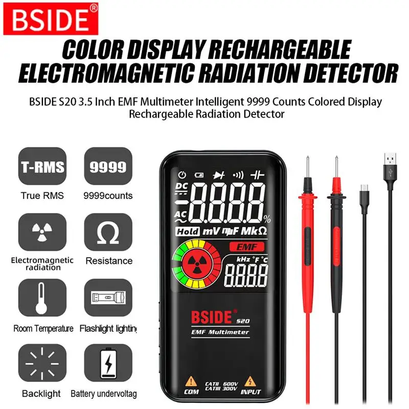Мультиметр BSIDE S20 3,5 дюйма EMF, интеллектуальный 9999 отсчетов, цветной дисплей, перезаряжаемый детектор излучения