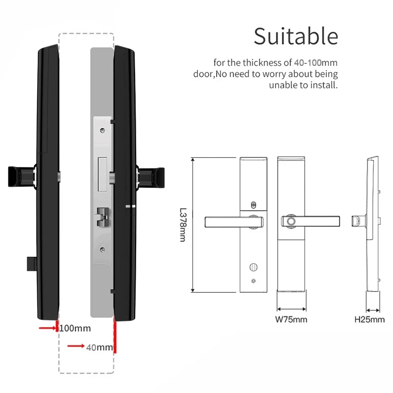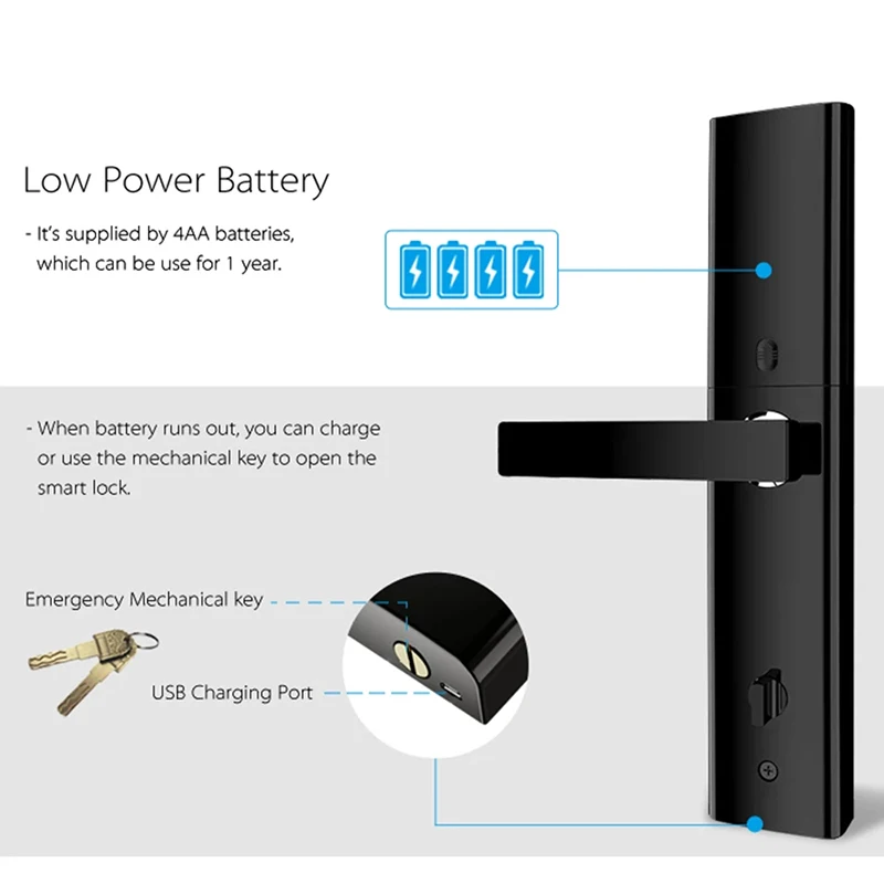 Размер панели: 360 мм x 78 мм x 25 ммЦвет: серебристый, черный,Материал: цинковый сплавСпособ открытия: приложение, пароль, отпечаток пальца, карта, ключКласс цилиндра: c-образный цилиндрПрименение: семья, квартира, школа, офисФункциональный: деревянная дверь/дверь безопасности/противопожарная дверь/нержавеющая дверьКорпус замка: устойчивость к пилению \ устойчивость к вытягиванию \ защита от взлома \ защита от кражиИсточник питания: 4 батарейки типа АА (не входят в комплект)Подходит для толщины двери: 1,57-4,33 дюйм (ов) или 40-110 ммКоличество группы хранения отпечатков пальцев: 200Аксессуары: 3 пряжки или карты + 1 admin card + 2 механических ключа