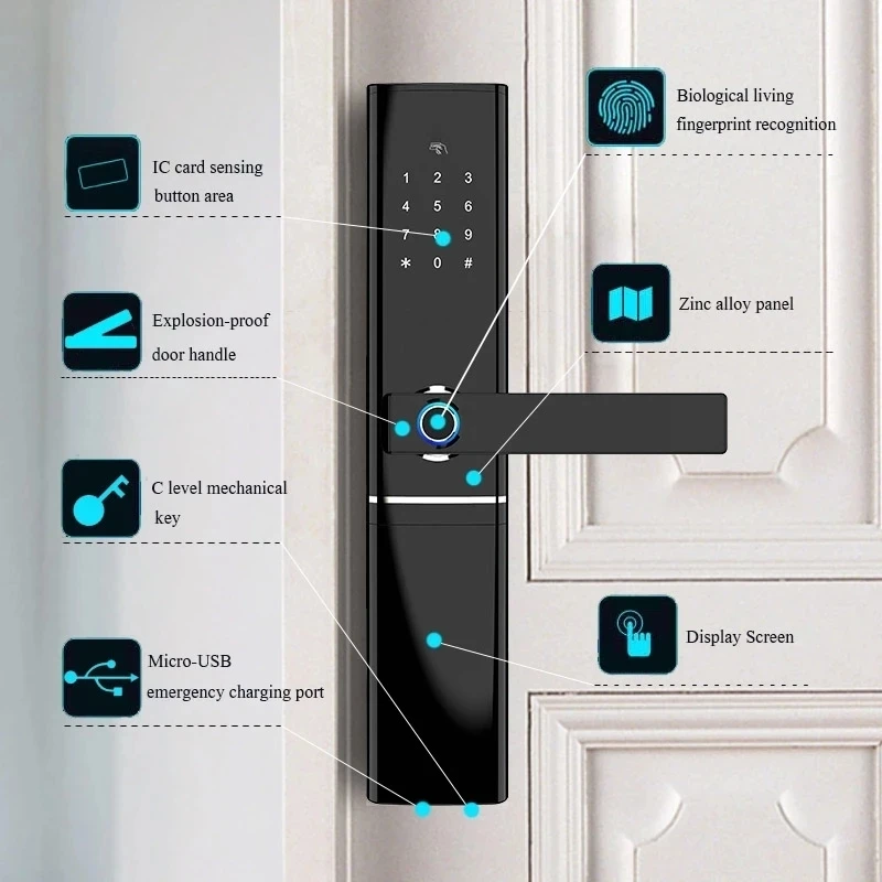Этот замок изготовлен из сплава цинка, несколько цветов, это идеальный коммерческий замок для бизнеса,Дом и квартира, которым нужен доступ для нескольких людей. Он поставляется с врезной поверхностью, особенно хорошо подходит для наружных дверей.Вы можете дать временные коды/карты/отпечатки пальцев для гостей, посетителей, домработниц или сотрудников-идеально подходит для работы