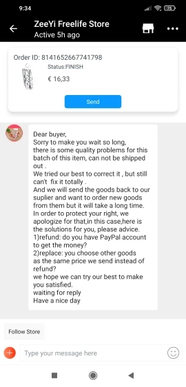 Продавец утверждал, что была проблема с качеством партии ведьмы, после того как оплатили и заплатили. Пробовал "вернуть" мне за пределами Aliexpress. Что очень вызывает подозрения в отношении некоторых схем... Все время продукт был доступен в продаже все время...