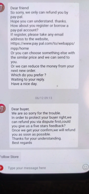Продавец никогда не отправил товар. Он утверждал, что невозможно доставить товар в мою страну, но сам отказался отменить заказ. Как только я подняла спор, он попросить меня отменить его и создать новый, в котором я бы сказал, что получил товар, но хотел бы вернуть его. Это была, безусловно, афера.