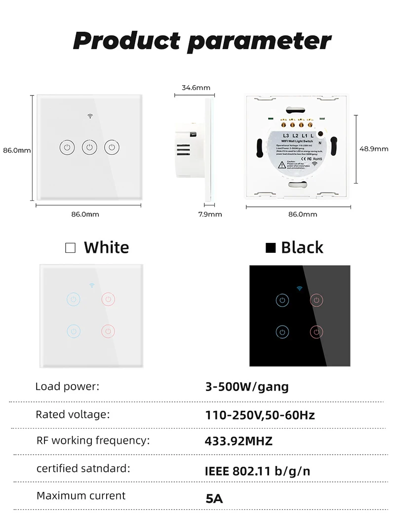 【Чувствительное сенсорное управление】Сенсорный экран из закаленного стекла этого Смарт-переключателя чувствителен к касанию управления, высококачественный прочный стеклянный материал обеспечивает до 20 миллионов сенсорных фигур через наше тщательное тестирование. Водонепроницаемость, защита от влаги, Защищает от царапин.