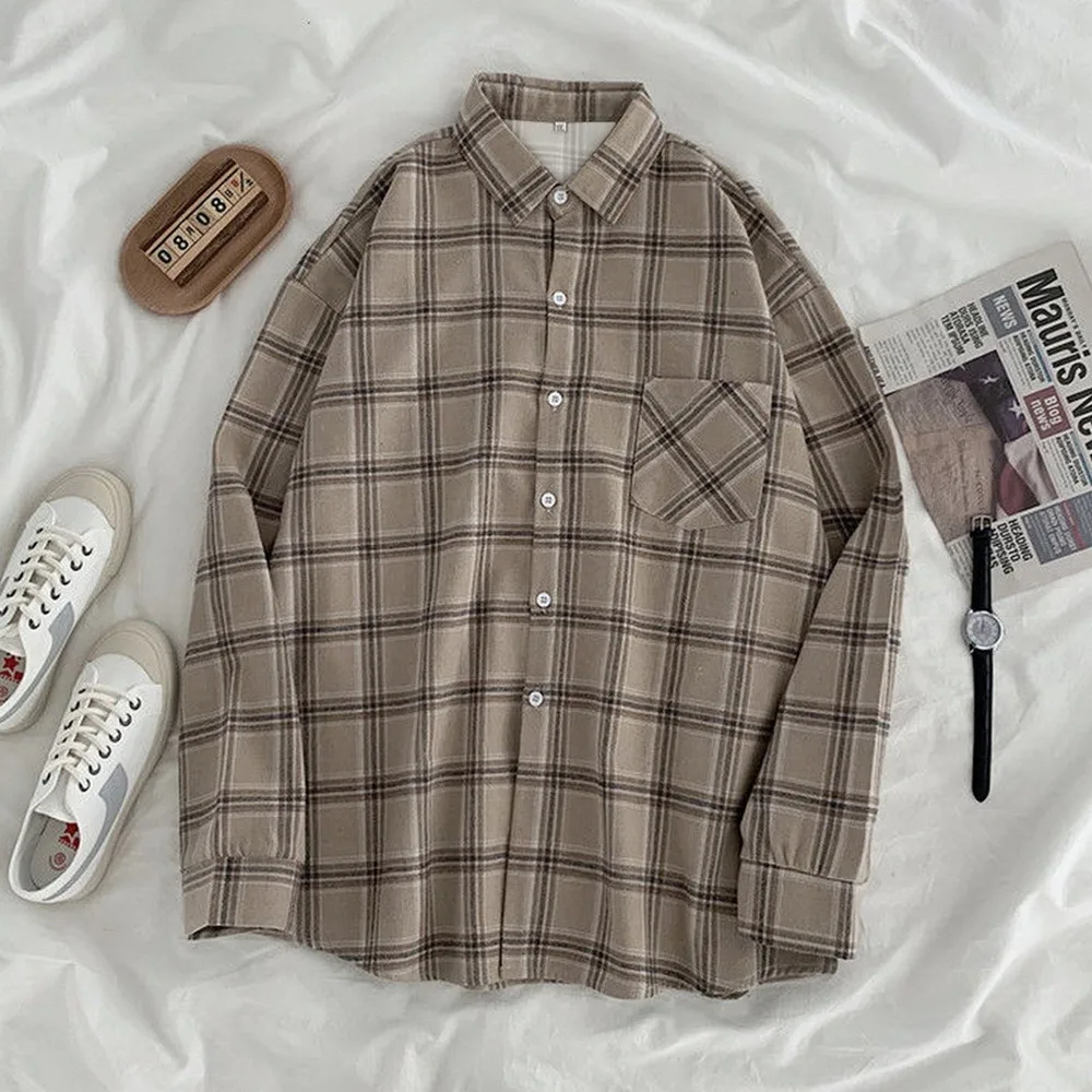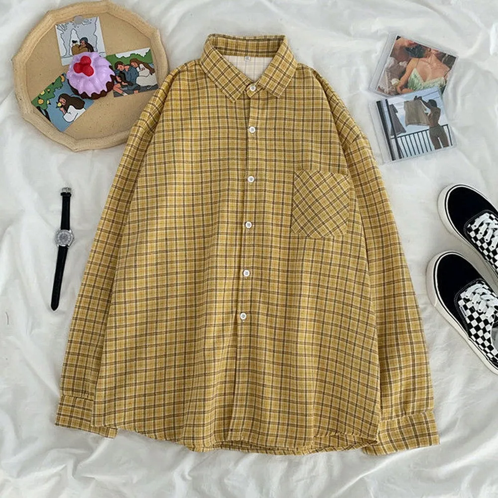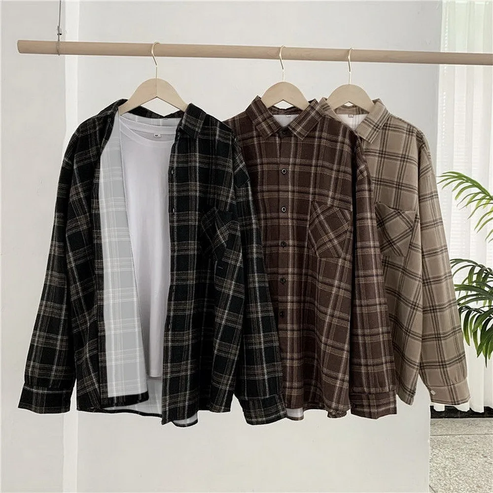 Женская рубашка в клетку, женская блузка в стиле оверсайз, топ в Корейском стиле, женские топы с длинным рукавом, повседневная женская верхняя одежда