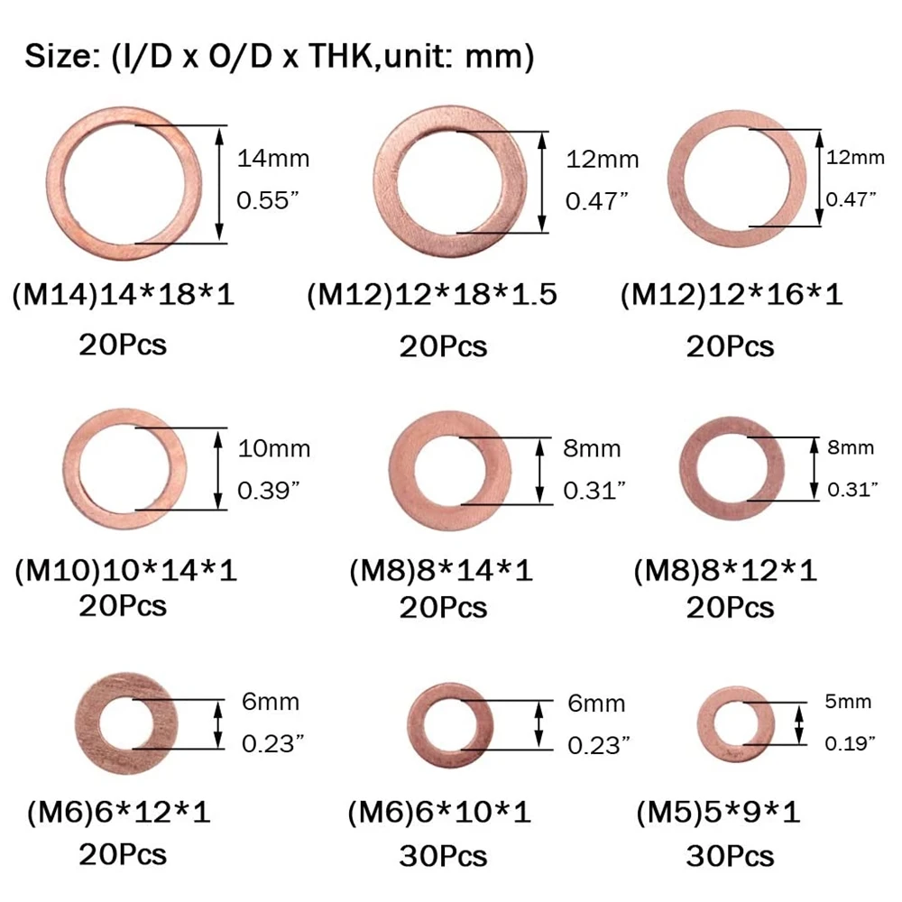 Абсолютно новыйМатериал: медьЦвет: как на изображенииРазмер коробки: прибл. 130x60x23 ммРазмеры: 9 (M5-M14)> Количество: 200 шт.Размер: (I/D x O/D x Глубина)M5 * 9*1 30 шт.M6 * 10*1 30 шт.M6 * 12*1 20 штM8 * 12*1 20 штM8 * 14*1 20 штM10 * 14*1 20 штM12 * 16*1 20 штM12 * 18*1.5 20 штM14 * 18*1 20 шт
