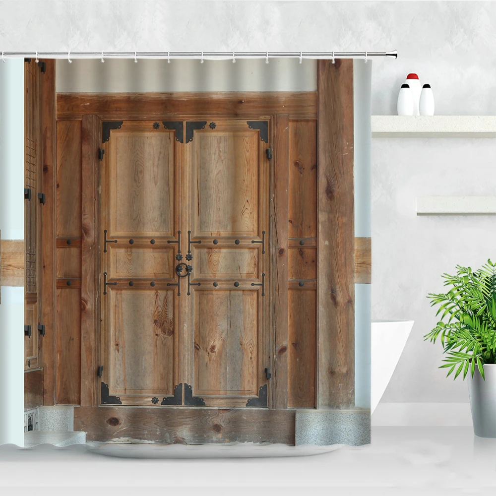 Занавеска для душа с деревянными дверями и крючками, винтажная Водо...