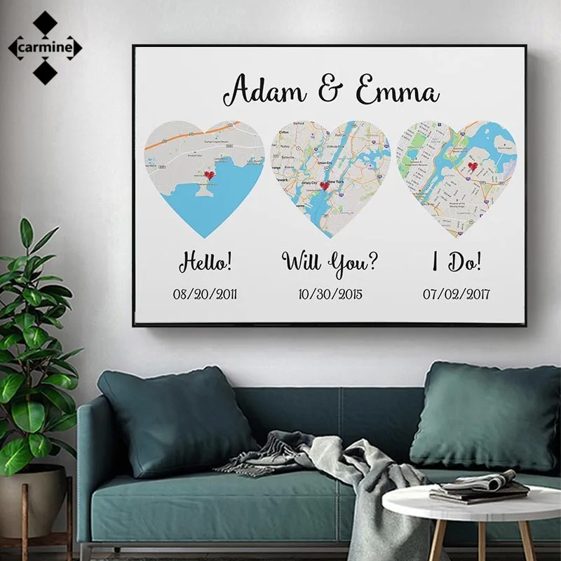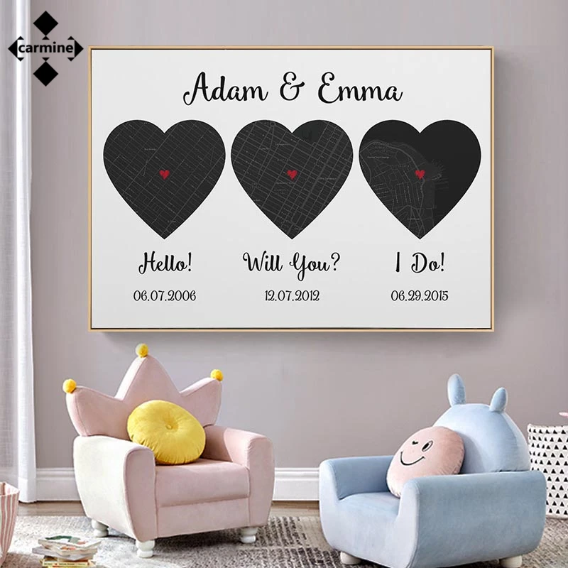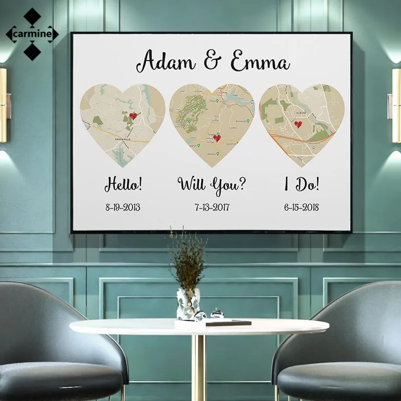 Индивидуальная карта с сердцем, Художественная печать на холсте, персонализированное настенное искусство, Здравствуйте, я сделаю романтические цитаты, Картина на холсте для юбилейного подарка
