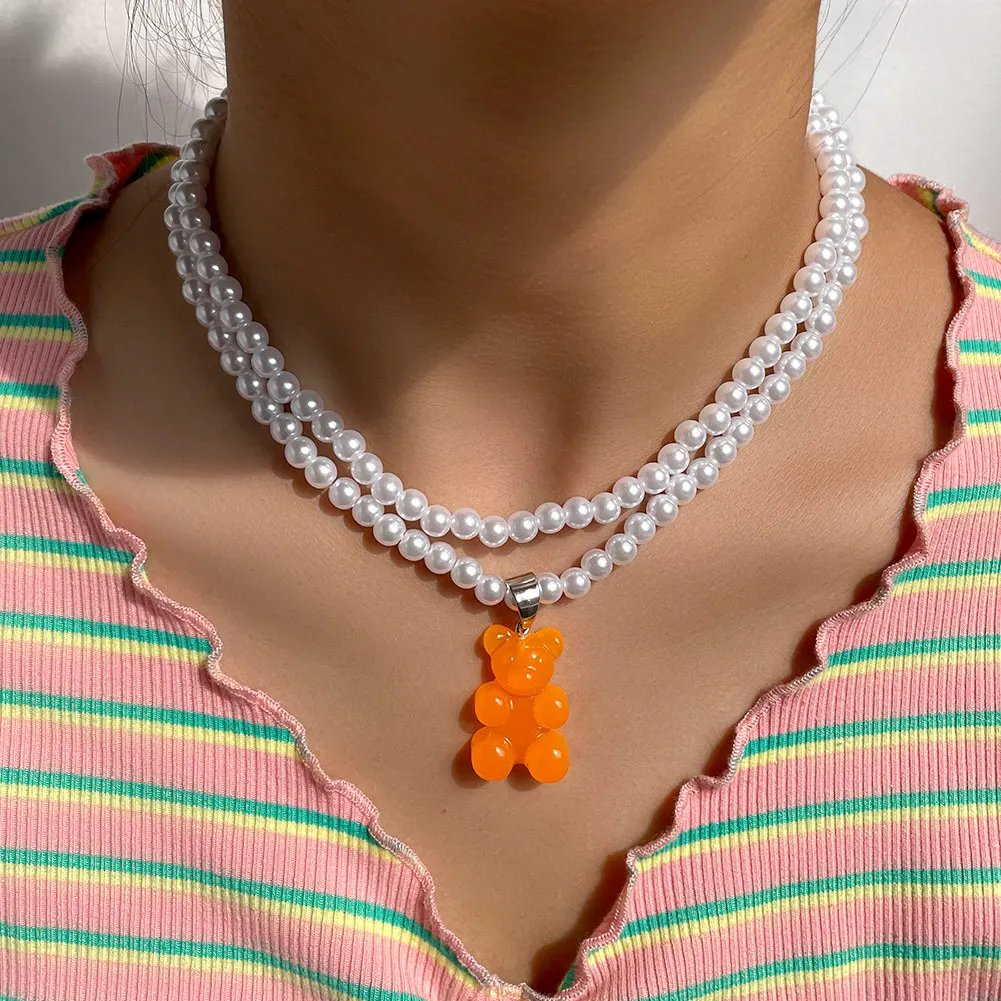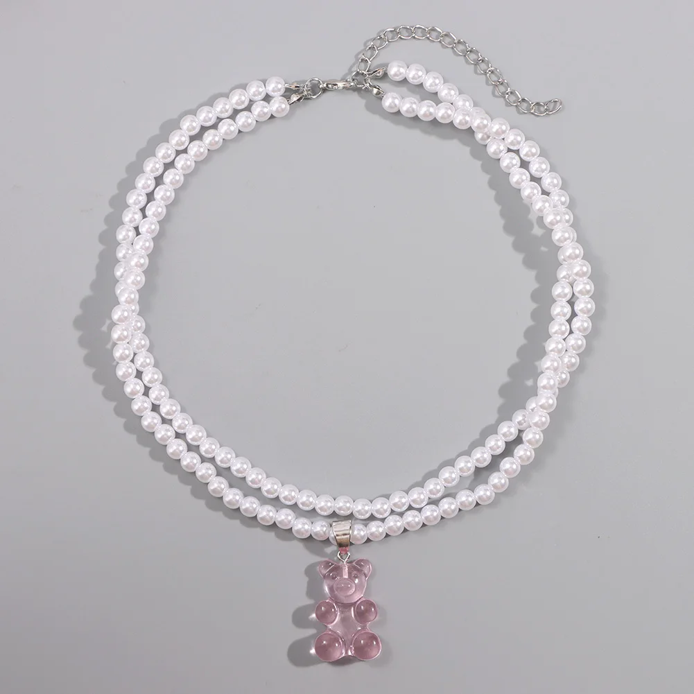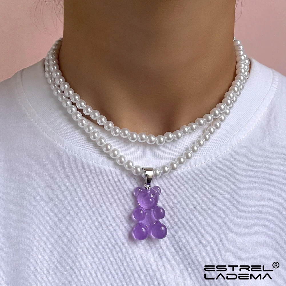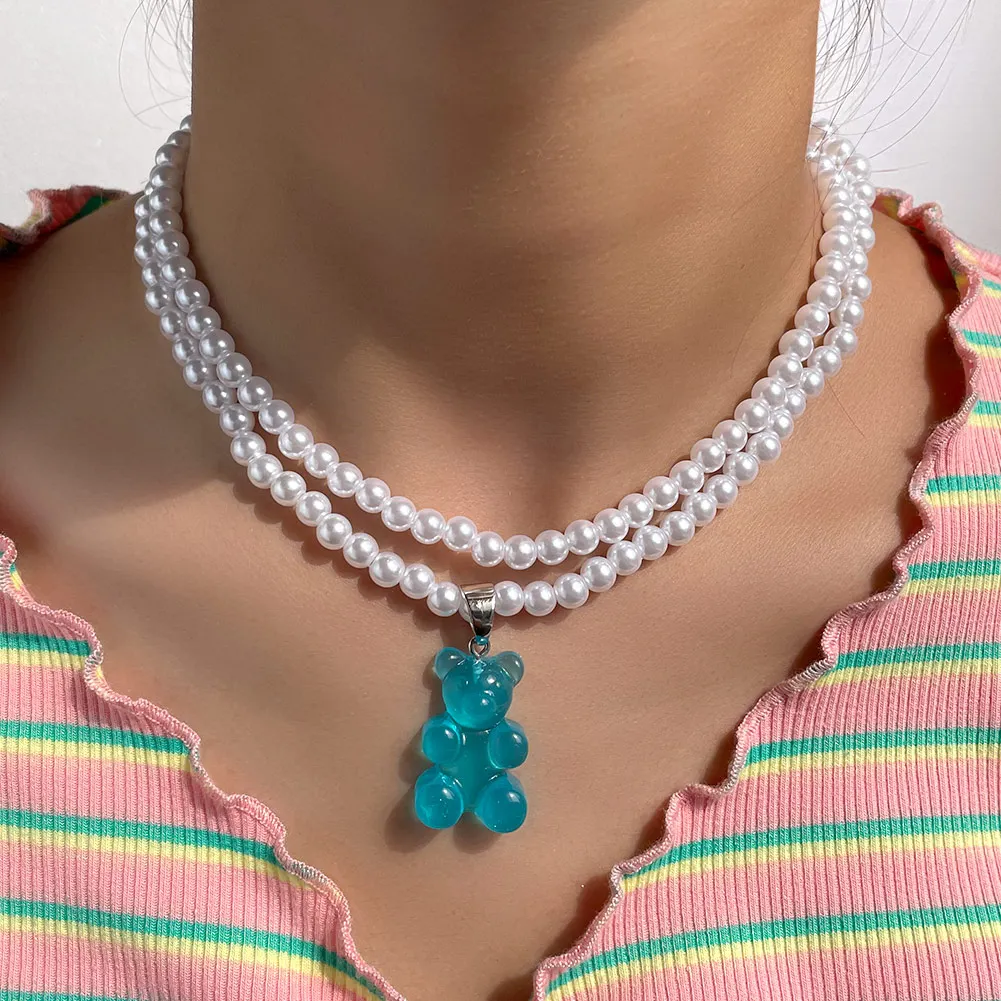 Двухслойное жемчужное ожерелье Y2k конфетных цветов с подвеской в виде медведя из жевательного жемчуга для женщин милая прозрачная подвеска в виде медведя ожерелье ювелирные изделия для воротника