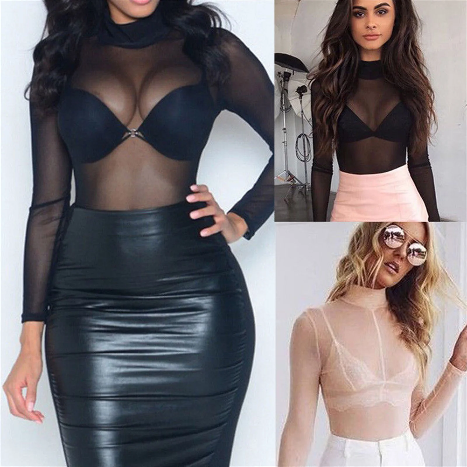 Женская рубашка с длинным рукавом, однотонная прозрачная рубашка с ложным воротником, облегающий прозрачный сетчатый модный топ
