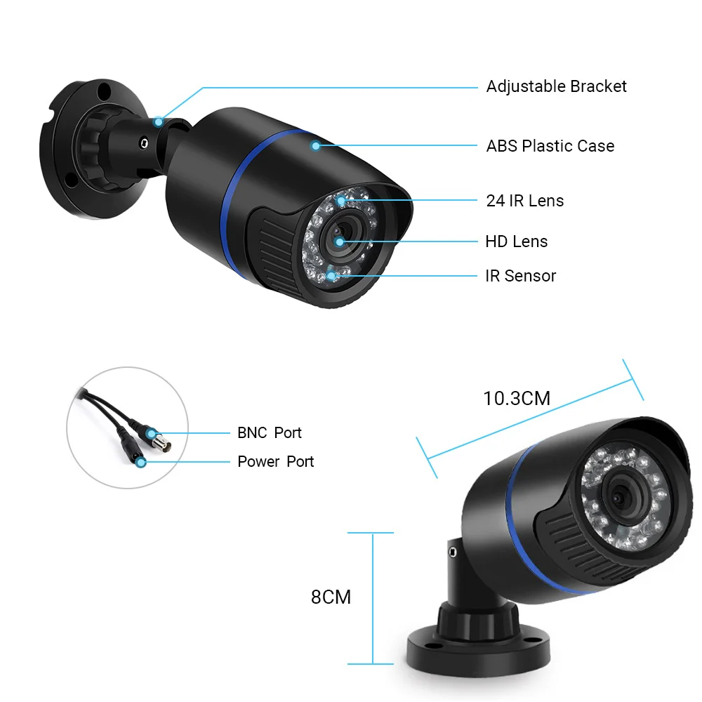 1. AHD 720P,1080P,5 Мп опционально2. 720P и 1080P камера 2,8 мм объектив, 5 Мп камера 3,6 мм объектив3. АБС-пластик, IP65 водонепроницаемый4. 24 шт. инфракрасный светильник, 20 м максимальное ИК-расстояние