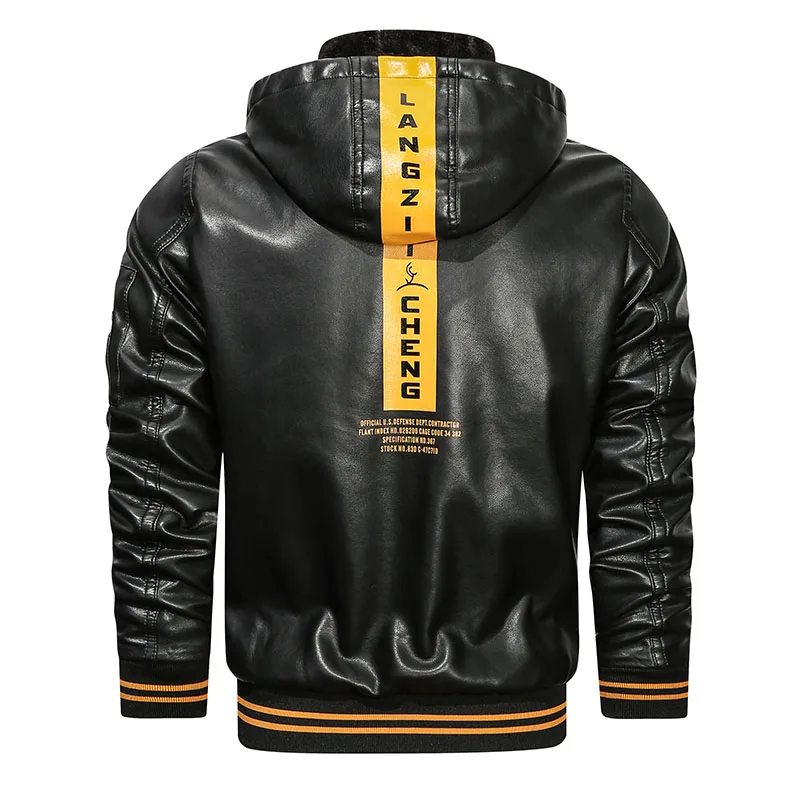 Мужская куртка из ПУ кожи, с капюшоном и надписью, на молнии