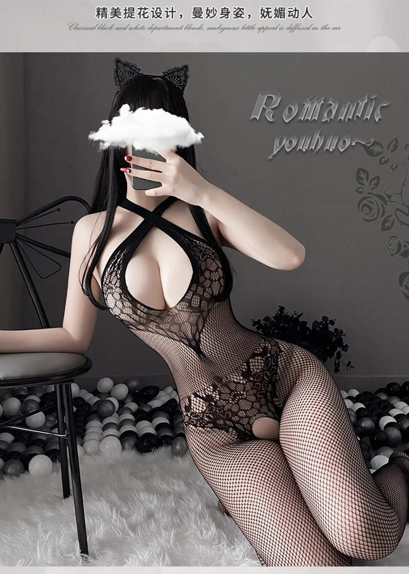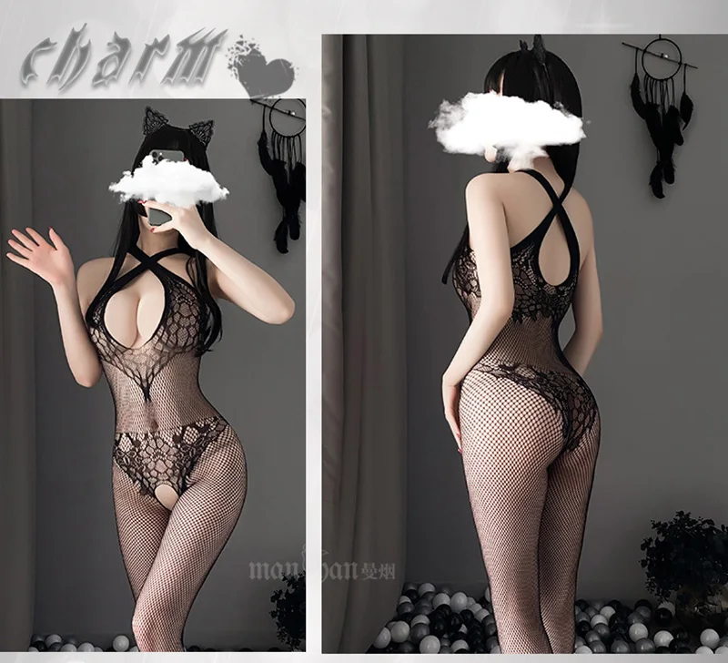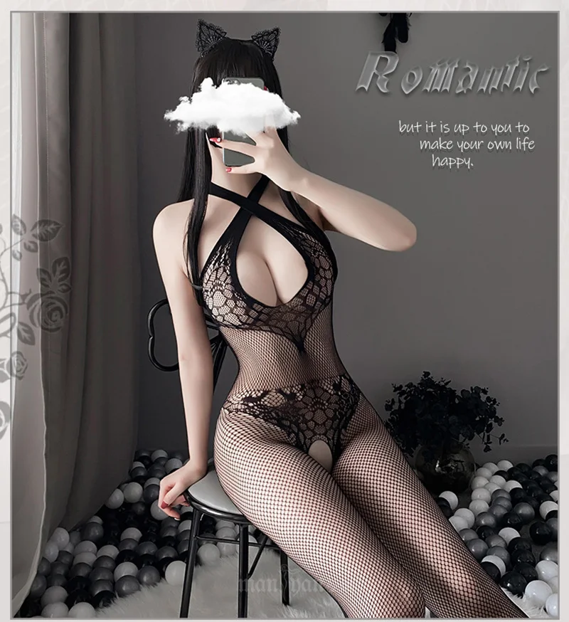 2021 сексуальный полый перспективный боди с открытой промежностью для женское нижнее белье «Babydolls» Крест Холтер Черный Сетчатый облегающий боди размера плюс