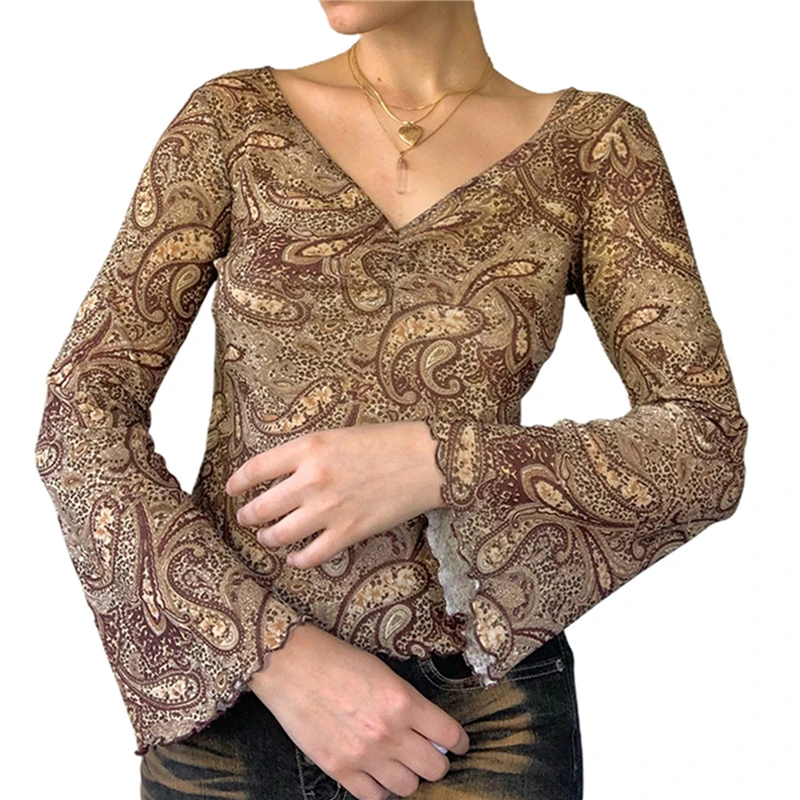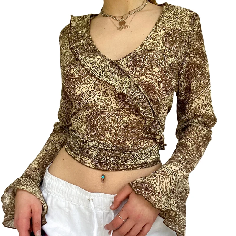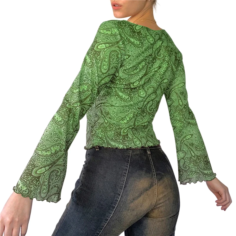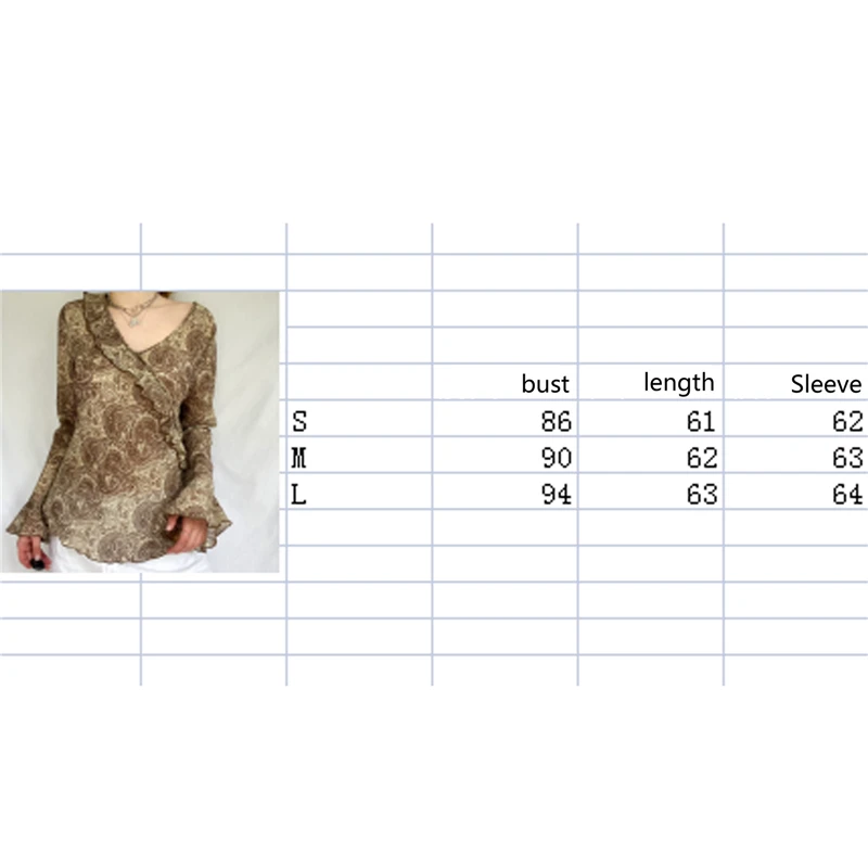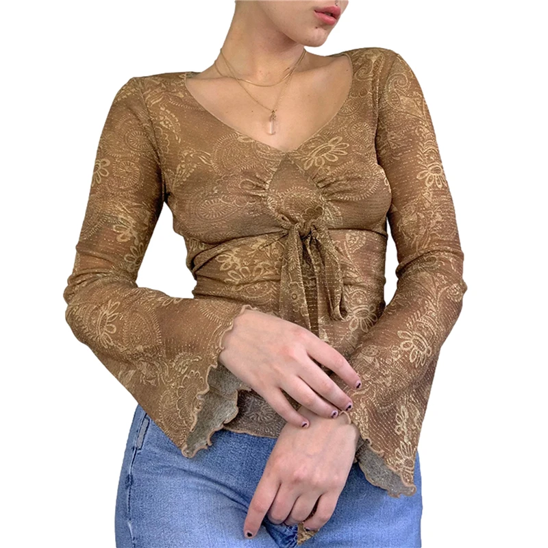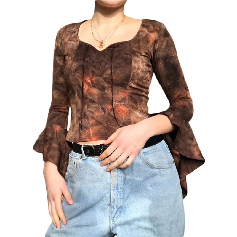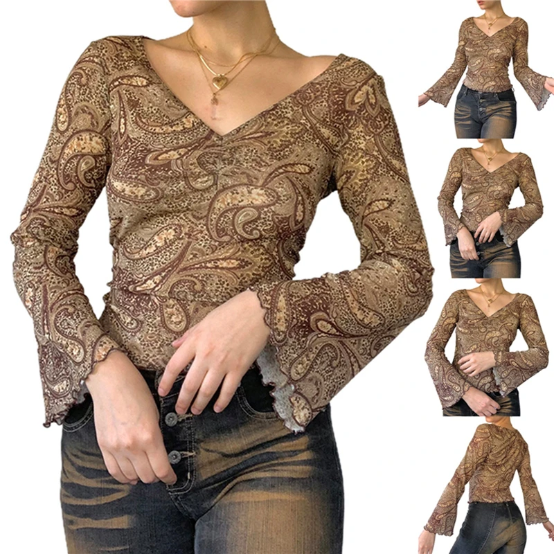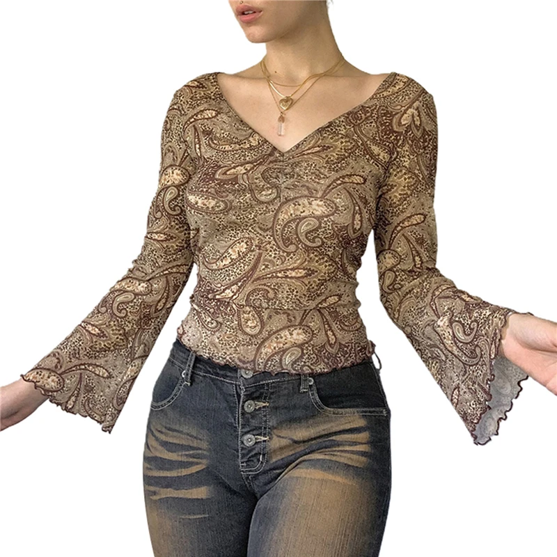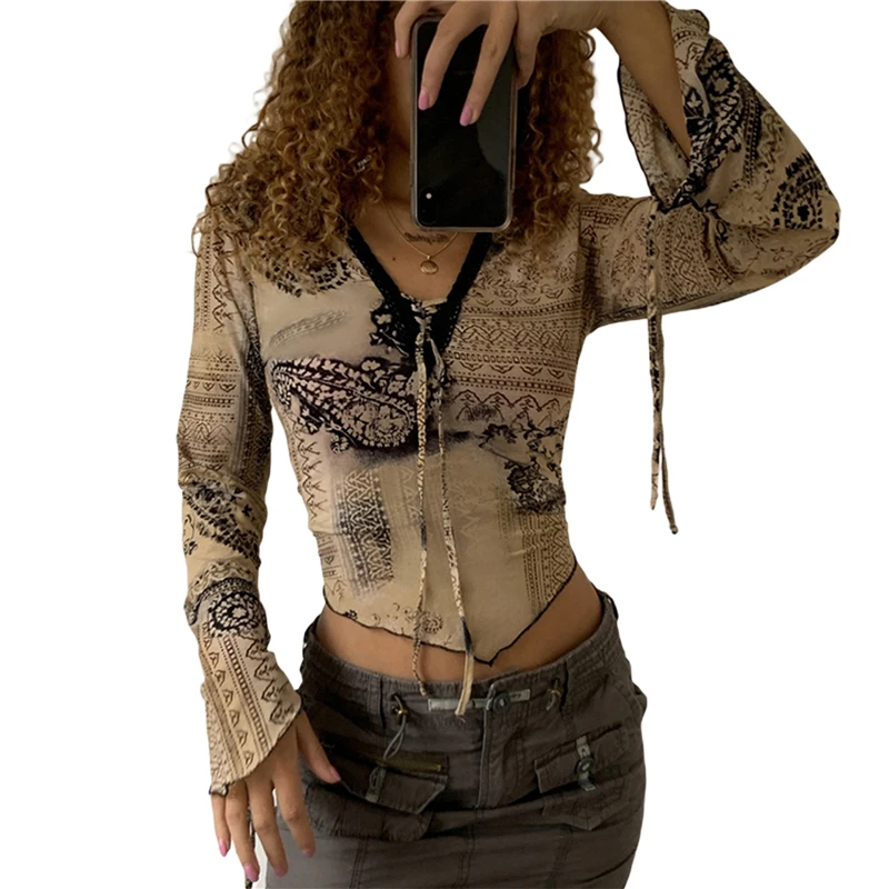 Женская футболка Xingqing, цвета хаки, с винтажным принтом, V-образным вырезом, расклешенными длинными рукавами, Y2K