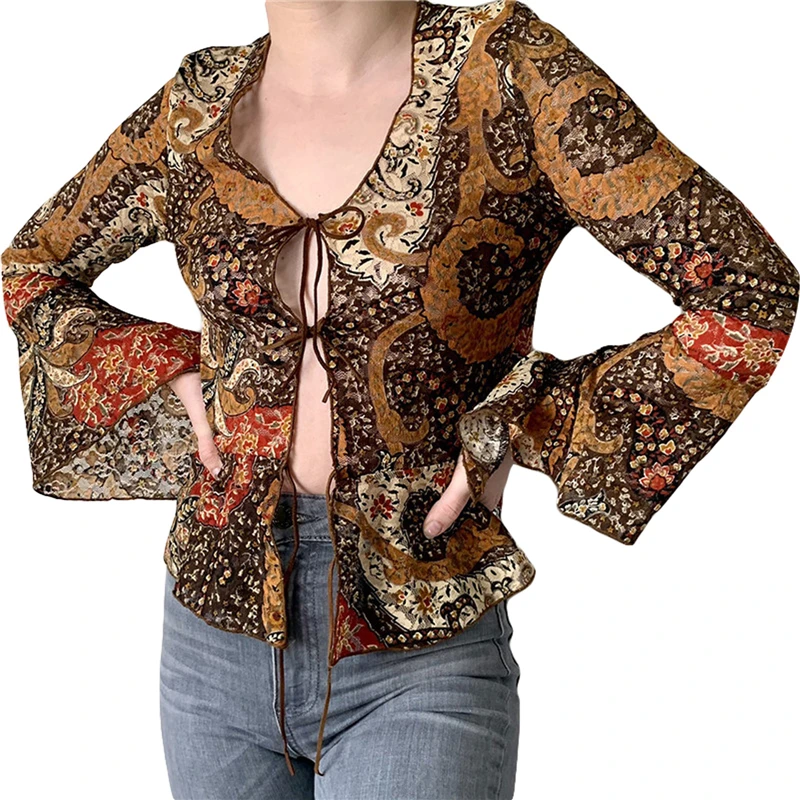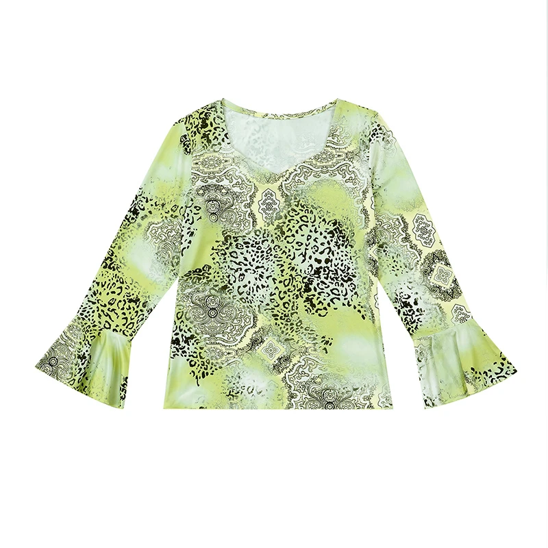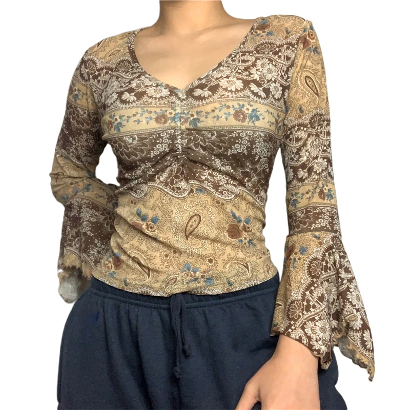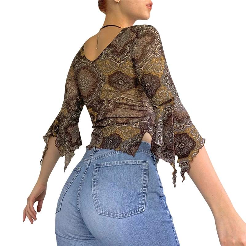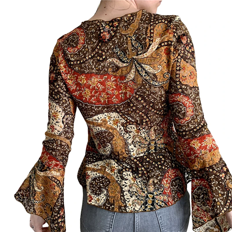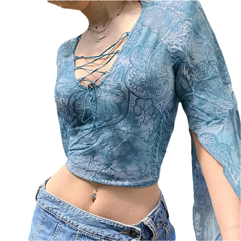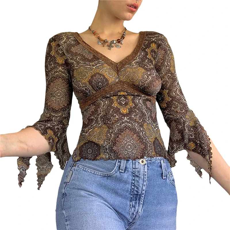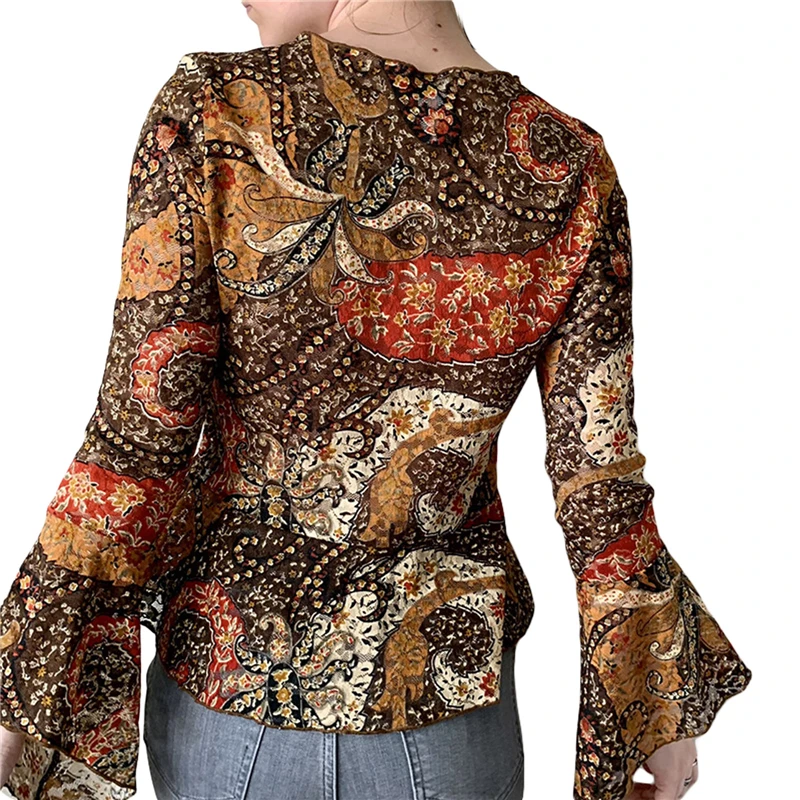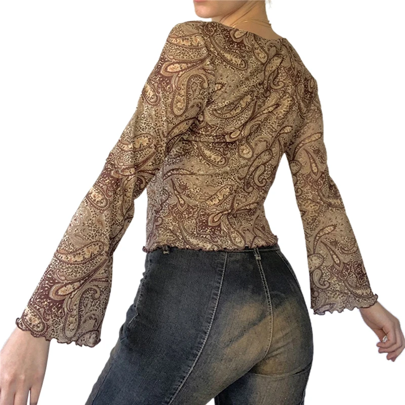 Женская футболка Xingqing, цвета хаки, с винтажным принтом, V-образным вырезом, расклешенными длинными рукавами, Y2K
