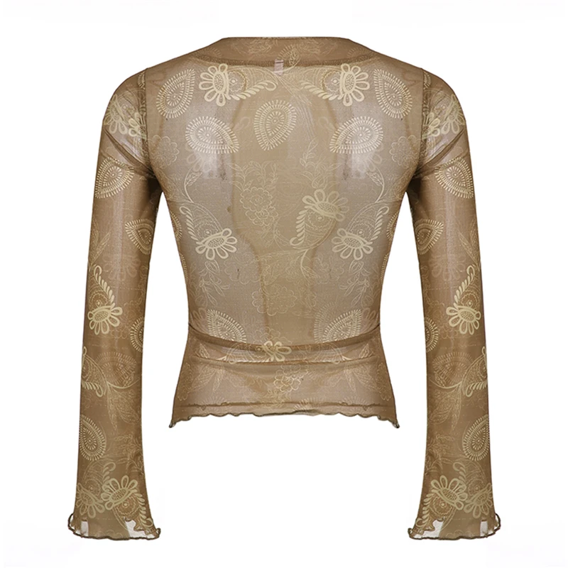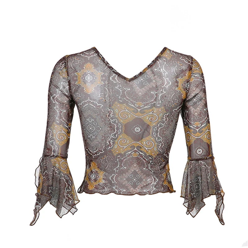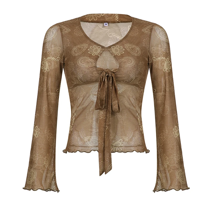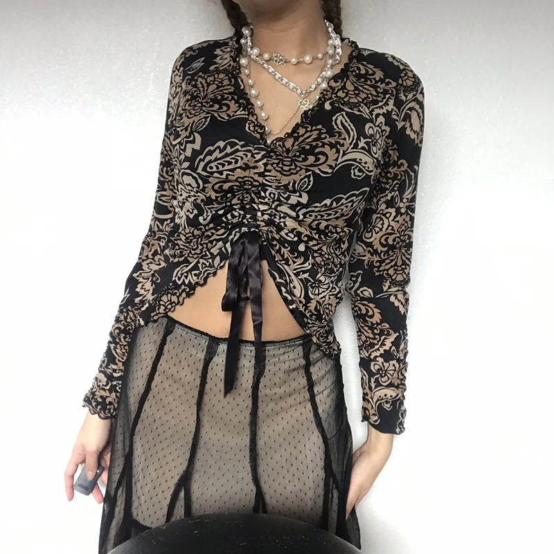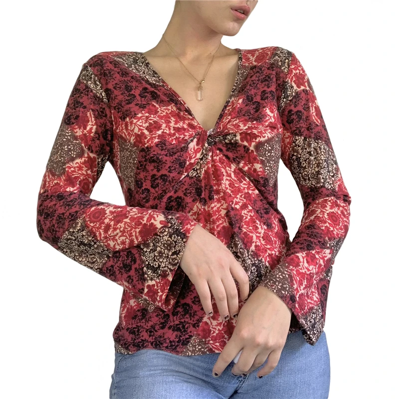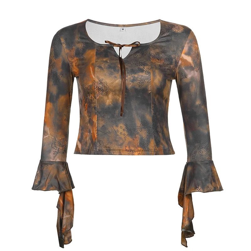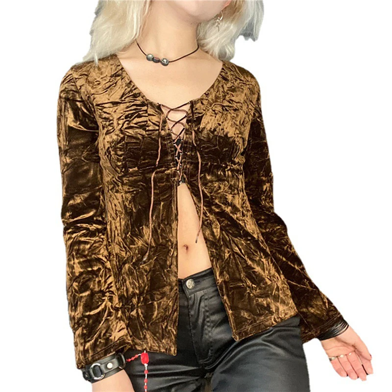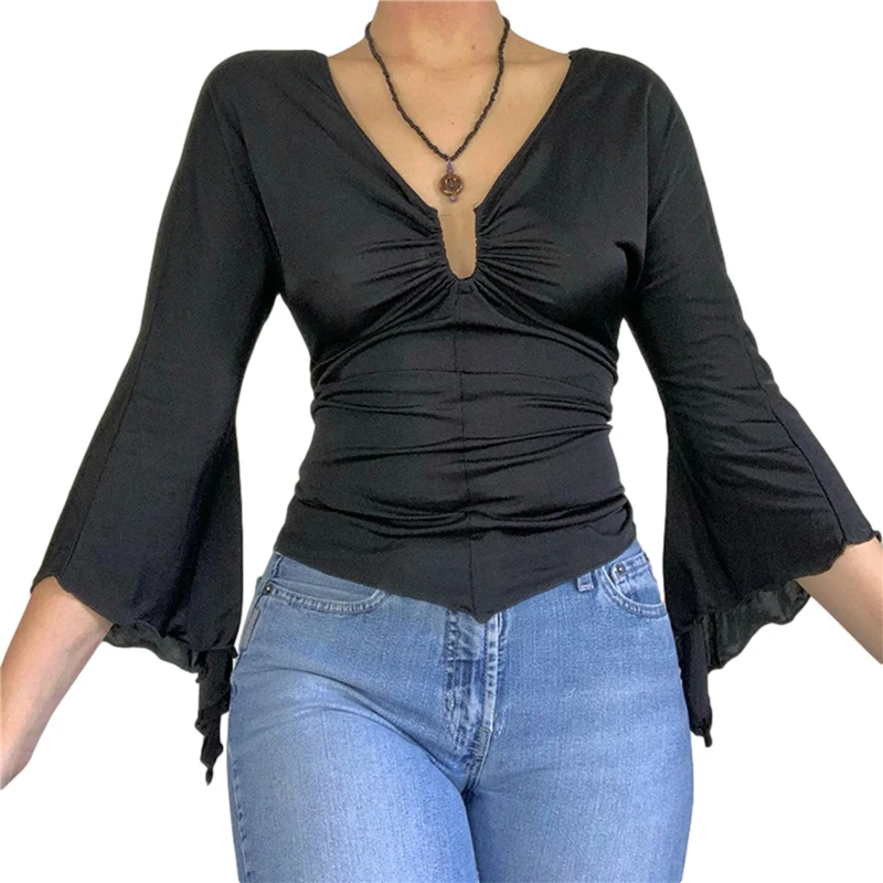 Женская футболка Xingqing, цвета хаки, с винтажным принтом, V-образным вырезом, расклешенными длинными рукавами, Y2K