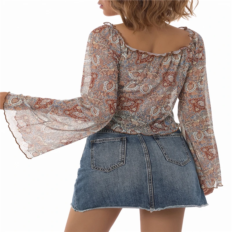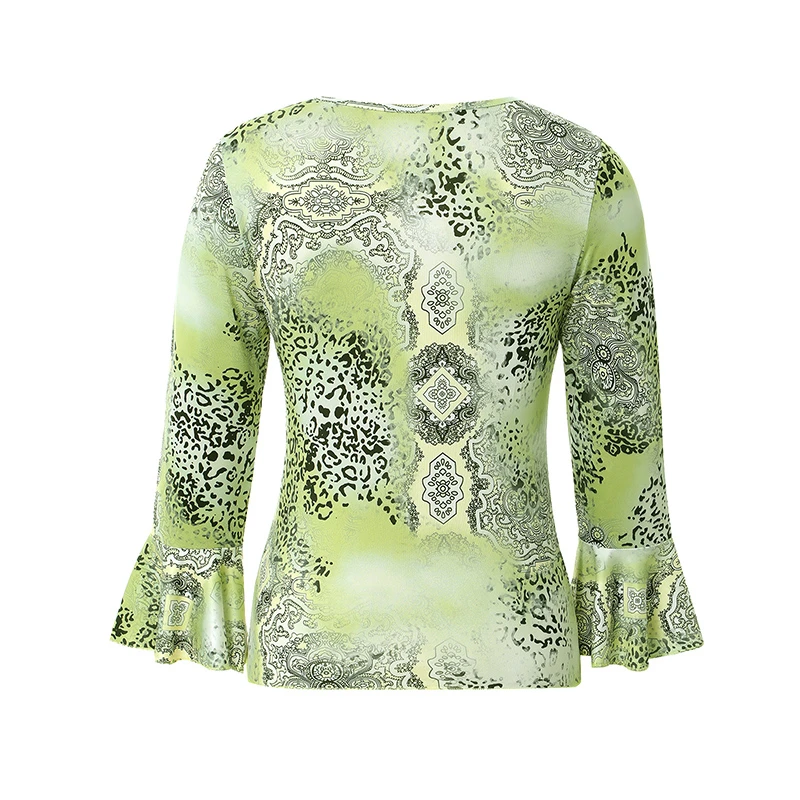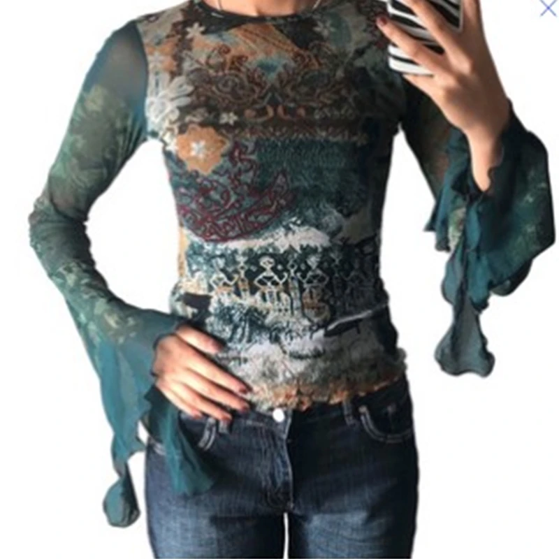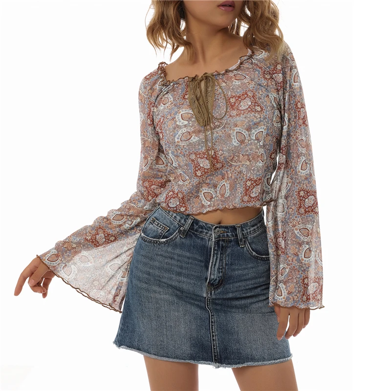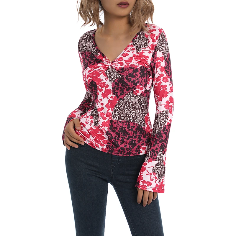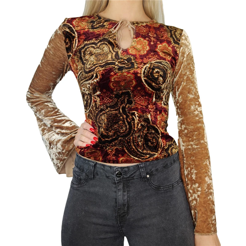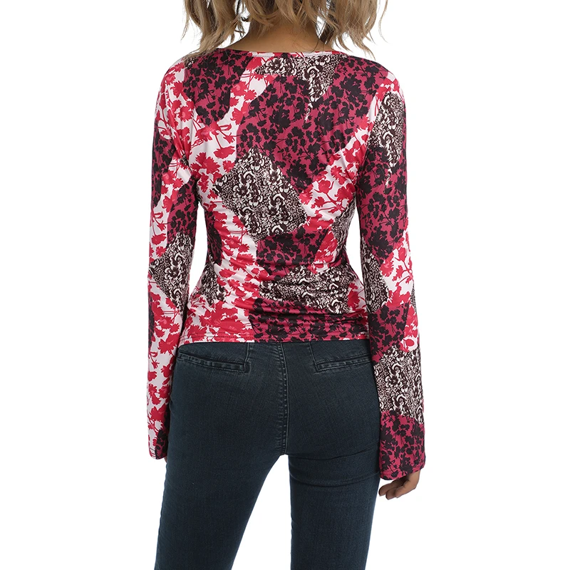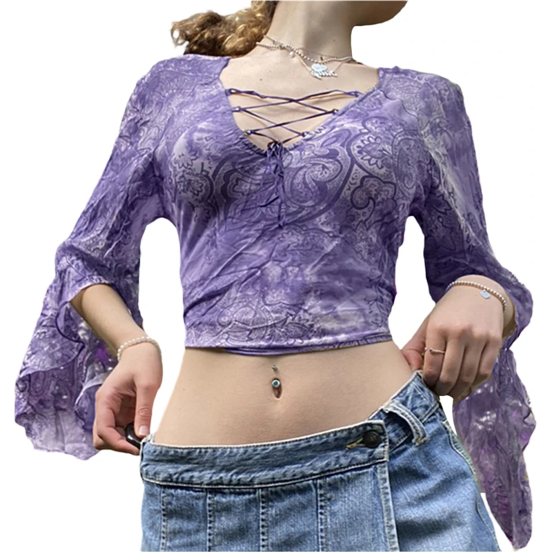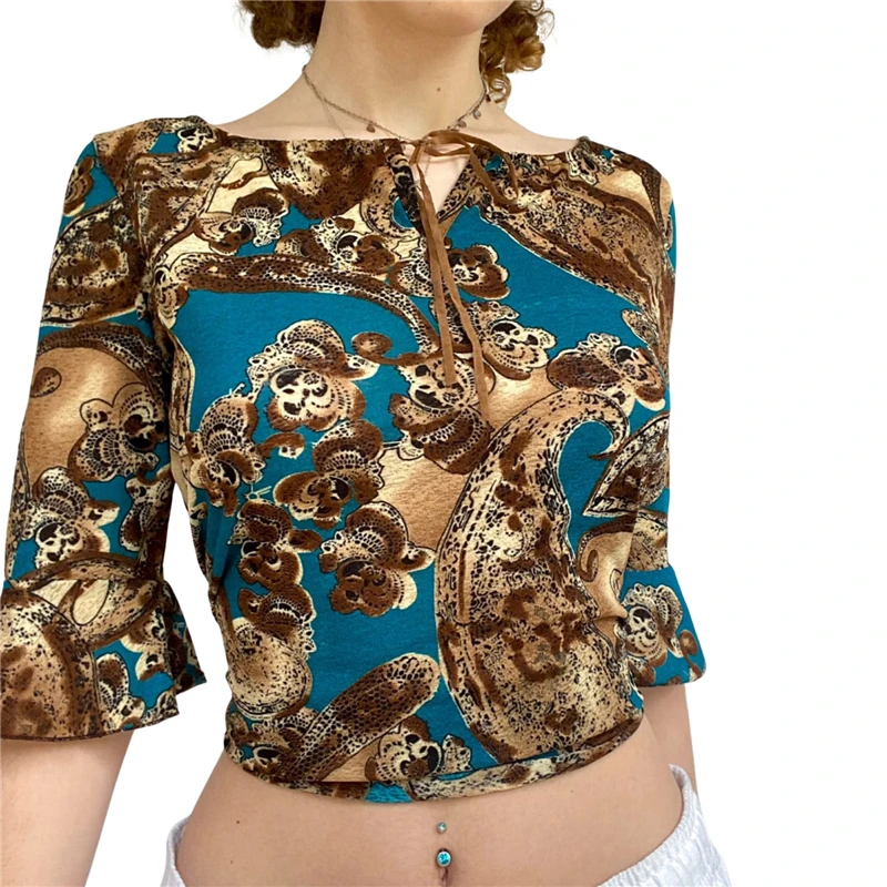 Женская футболка Xingqing, цвета хаки, с винтажным принтом, V-образным вырезом, расклешенными длинными рукавами, Y2K