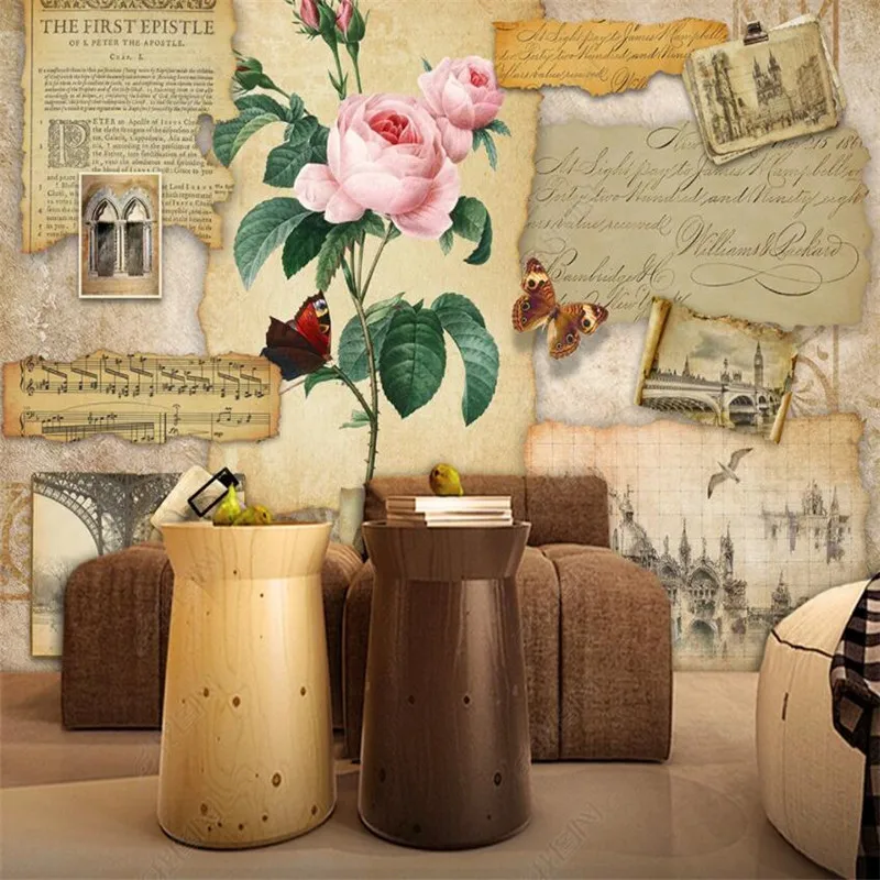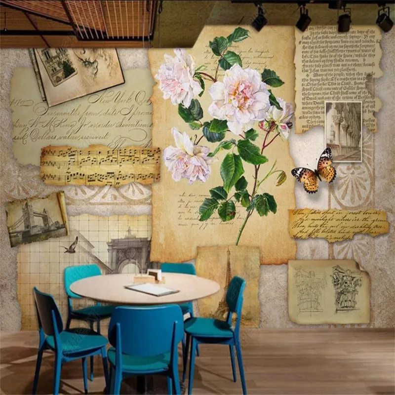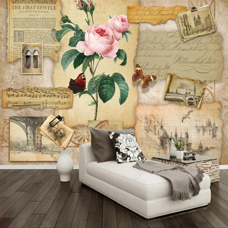 Настенная 3D Бумага в стиле ретро под заказ, старая газета, роза, цветок, домашний индустриальный декор, панно для баров и кафе, Декоративные самоклеящиеся обои