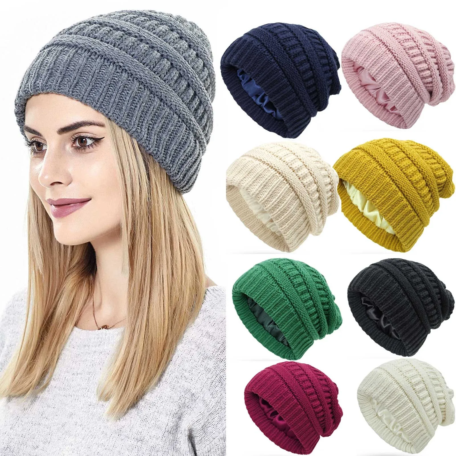 Зимняя Вязаная Шапка-бини, шапки для женщин, шелковая атласная шапк...
