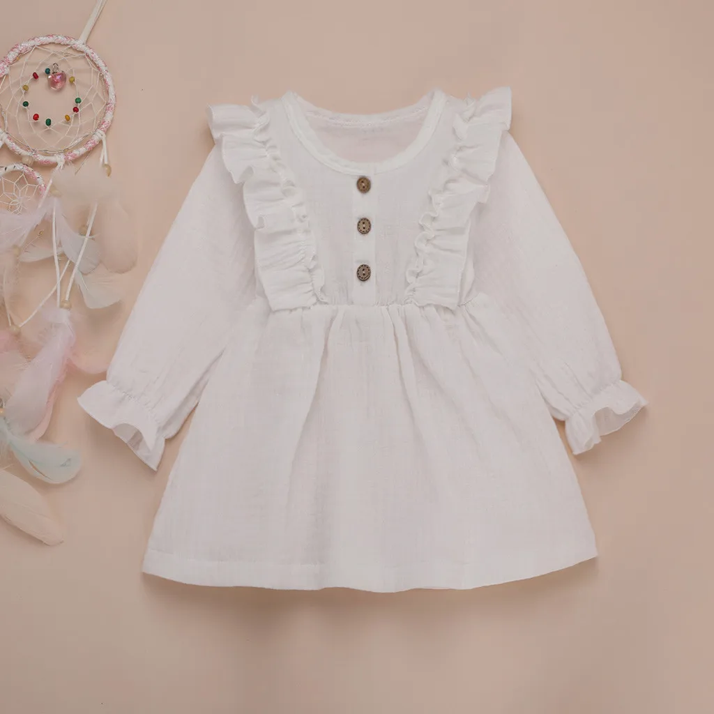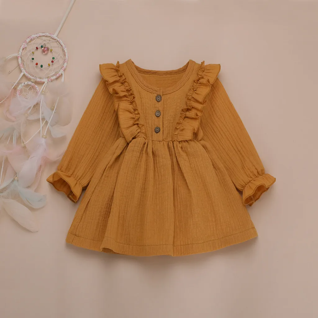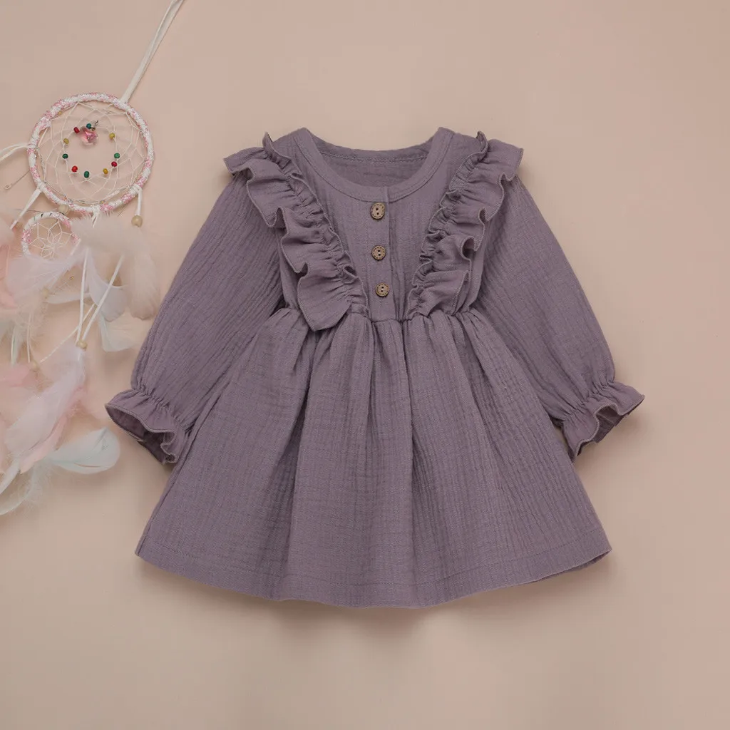Однотонные льняные вечерние платья принцессы с оборками и пуговицами для маленьких девочек