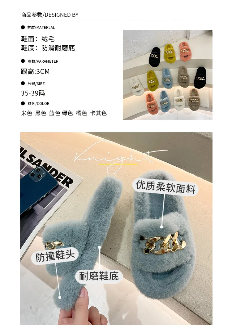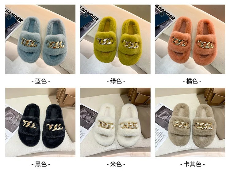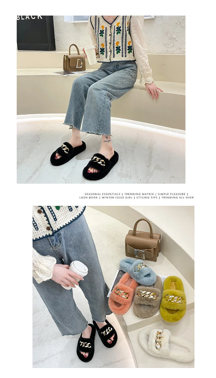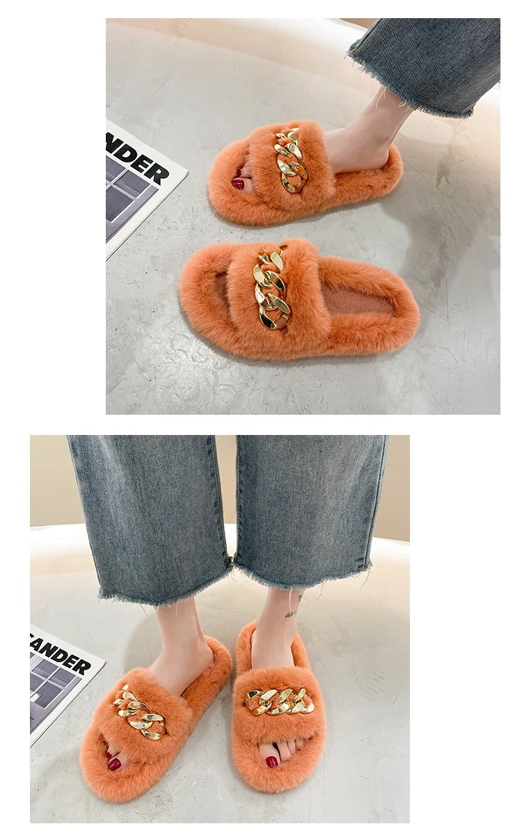 Женские модные теплые пушистые тапочки на металлической цепочке уютные напольные Шлепанцы из искусственного меха для дома и улицы сланцы плоские мягкие пушистые женские знаменитости Fli