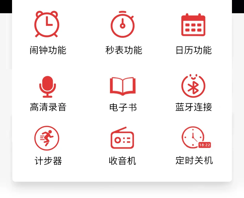 Функция:Функция будильникаФункция секундомераФункция календаряЗапись в формате HDЭлектронная книгаСоединение BluetoothШагомерРадиоОтключение по времени