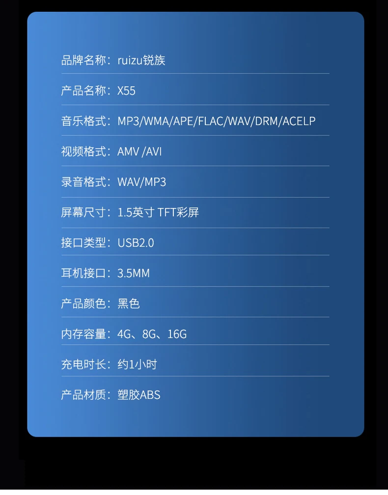 Характеристики:Бренд: RuizuМодель продукта: X55Формат музыки: MP3/WMA/APE/FLAC/WAV/DRM/ACELPФормат видео: AMV/AVIФормат записи: WAV/MP3Экран Размер: 1,5 дюймов TFT цветной ЭкранТип интерфейса: USB2.0Разъем для наушников: 3,5 ммЦвет: черныйОбъем памяти: 8GВремя зарядки: около 1 часаМатериал изделия: АБС-пластик