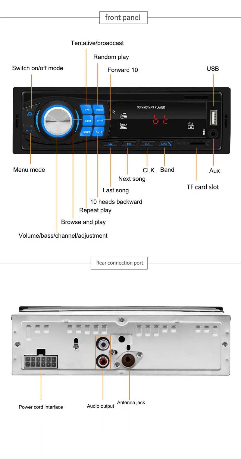 Bluetooth Hands free, U disk play, TF card play, Aux Play, fm-радио, отображение времени, воспроизведение памяти, EQ звуковые эффекты, инфракрасный пульт дистанционного управления