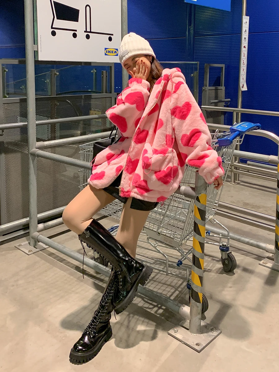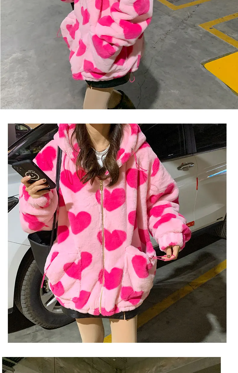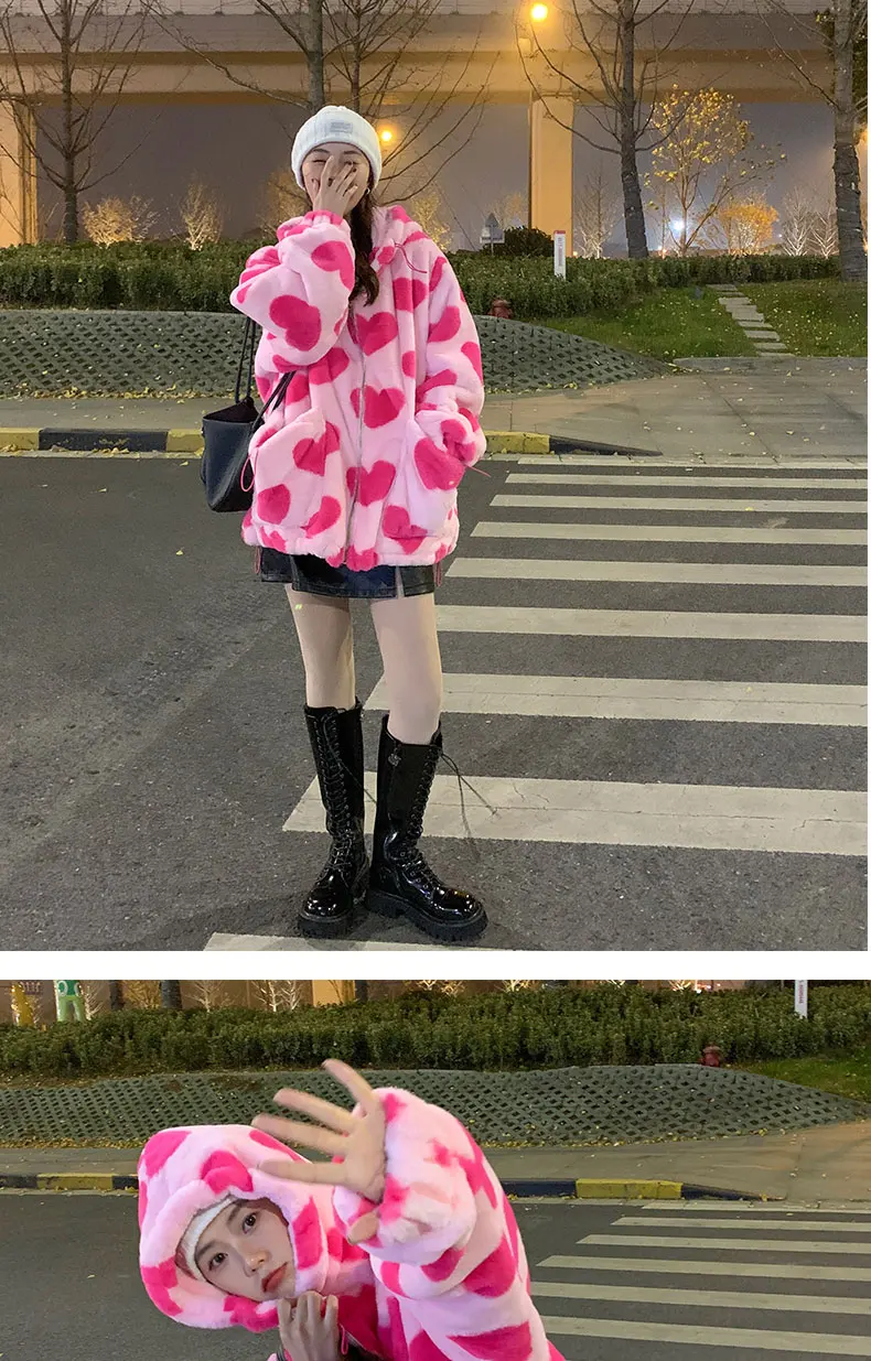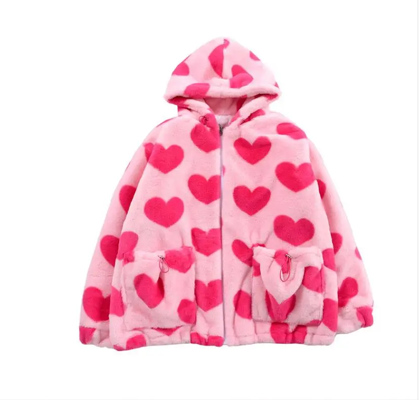 Женская плюшевая куртка y2k в стиле Харадзюку с принтом в виде серд...