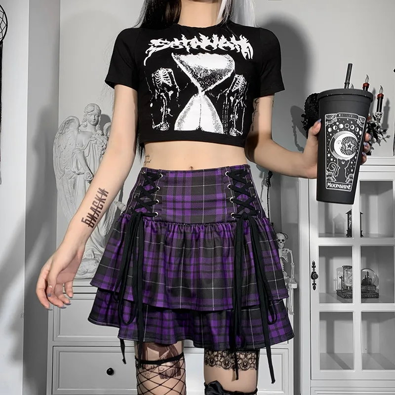 Фиолетовые клетчатые плиссированные юбки, Готическая Женская бандажная мини-юбка с высокой талией в стиле панк, сексуальная женская одежда в стиле Харадзюку