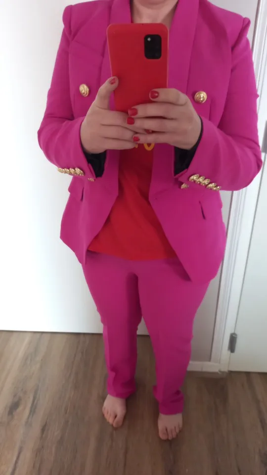 Женский офисный брючный костюм, комплект из двух предметов, двубортный блейзер с золотыми пуговицами и брюки, деловые костюмы, фиолетового, желтого и розового цвета