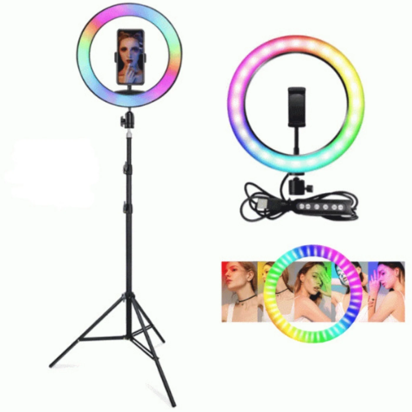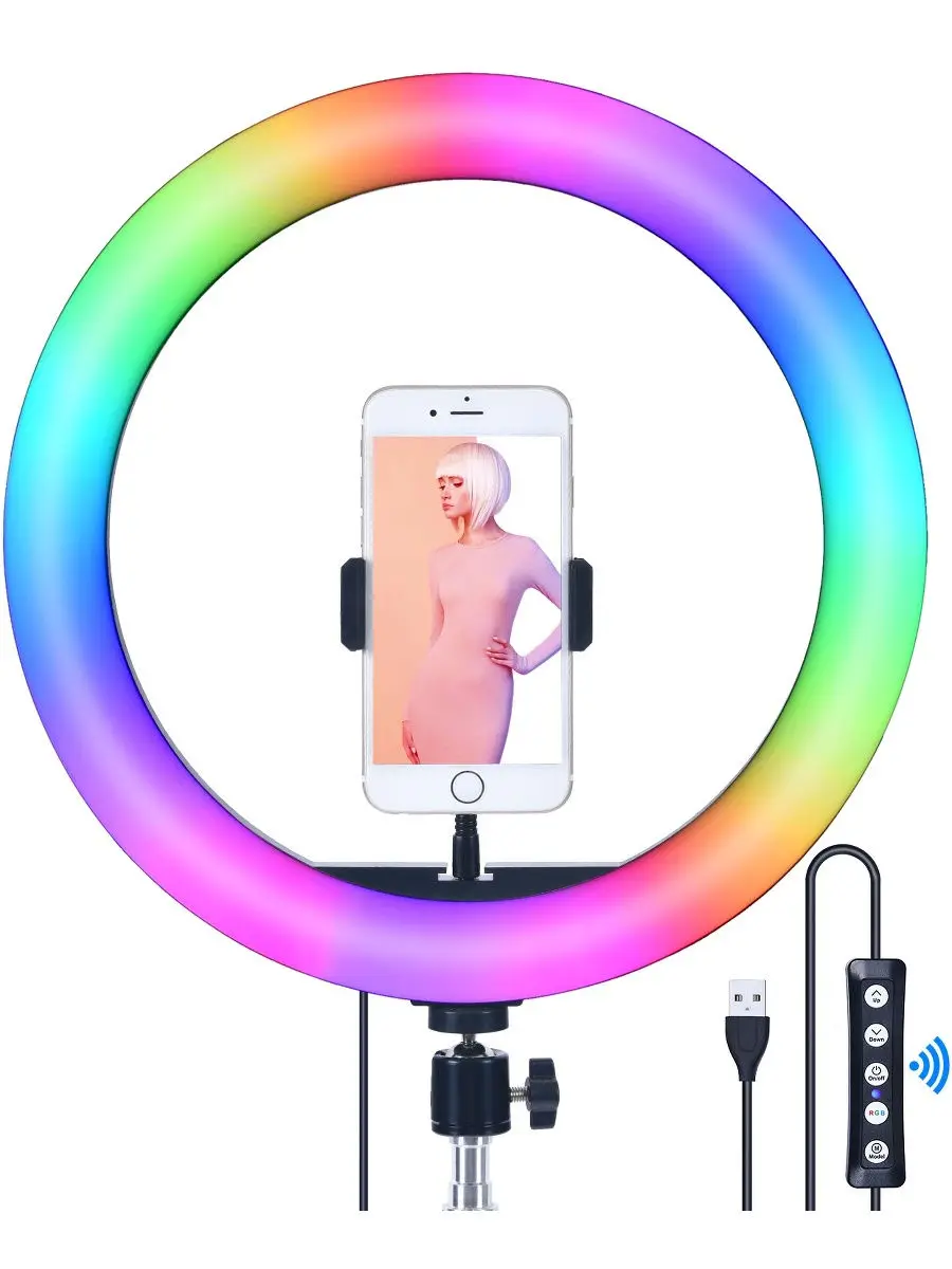Кольцевая светодиодная лампа цветная (мультиколор) RGB MJ33 33 см с держателем для смартфона и штативом 2.1 метра