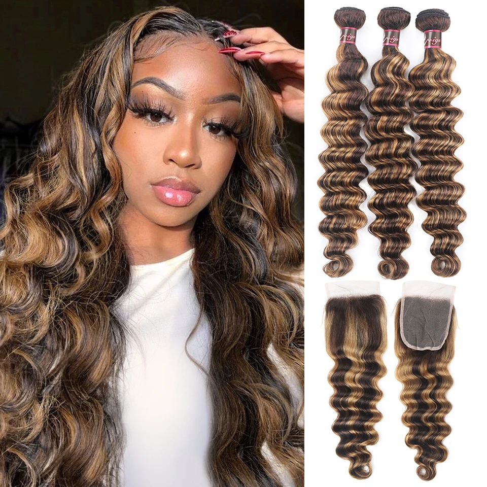 Пупряди хайлайтеров с глубокой волной и застежкой, пупряди коричневых человеческих волос с застежкой, 427 пучки Омбре, медовый блонд, пучки с застежкой, Реми