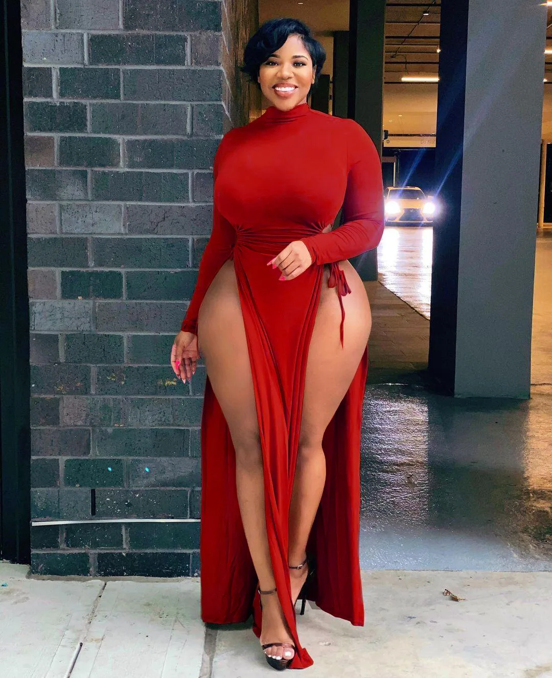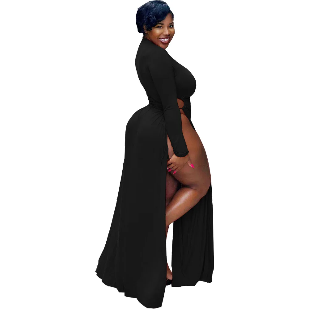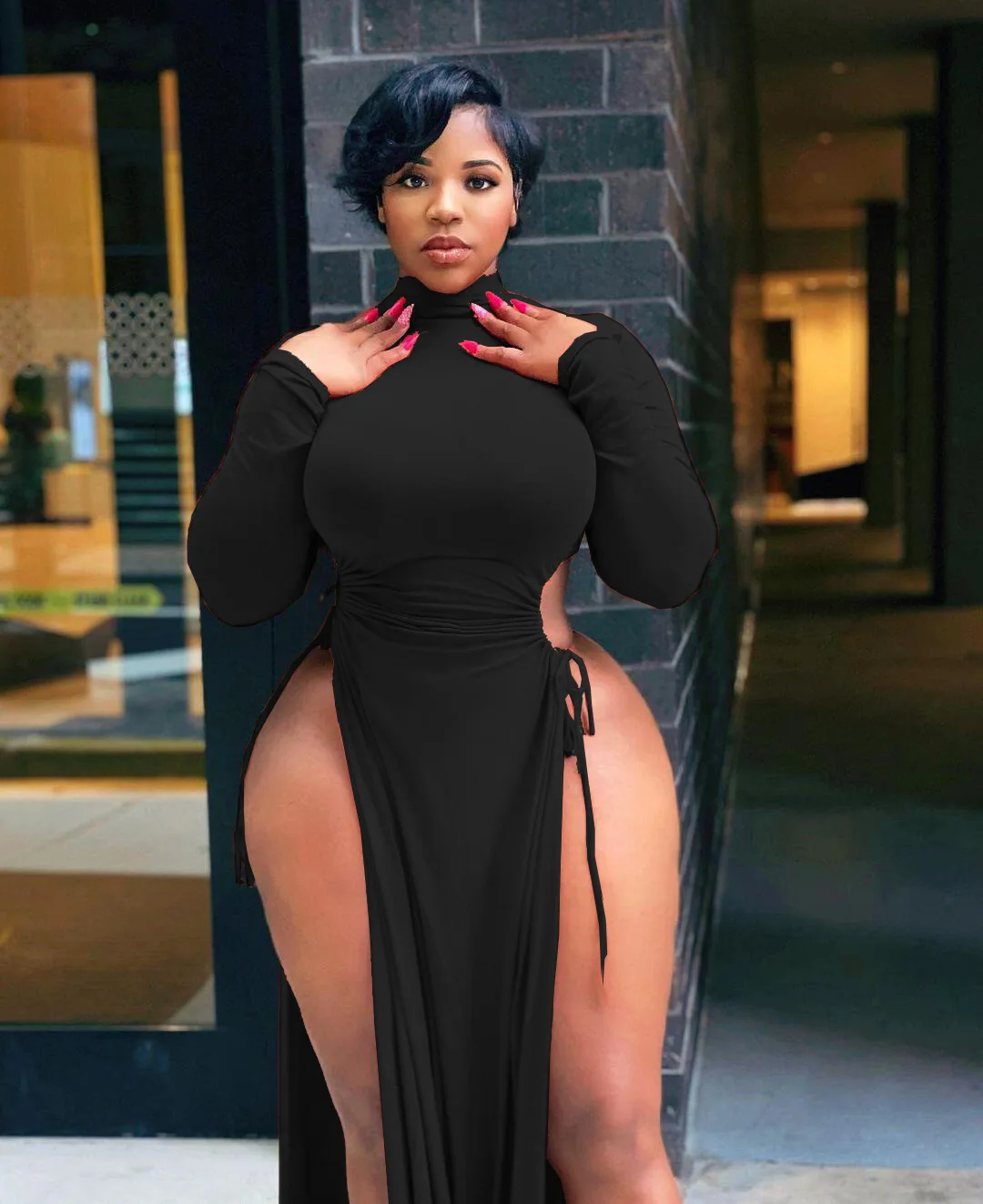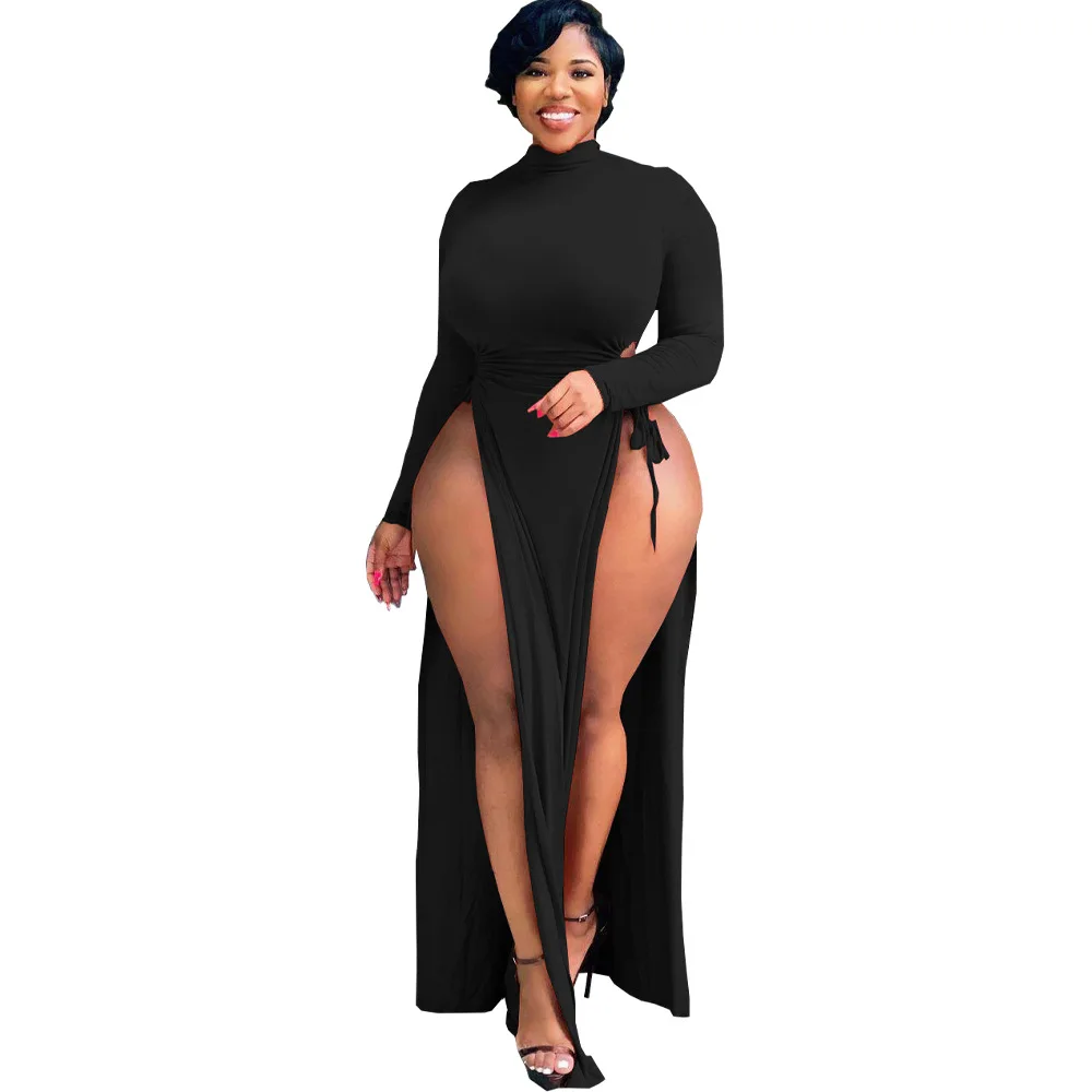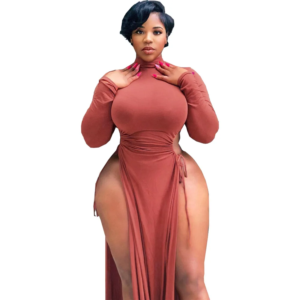 5XL размера плюс женское платье с высоким воротом на шнуровке корсет с высокой талией халаты Осенние Новые однотонные с высоким разрезом сексуальные большие размеры Макси платье