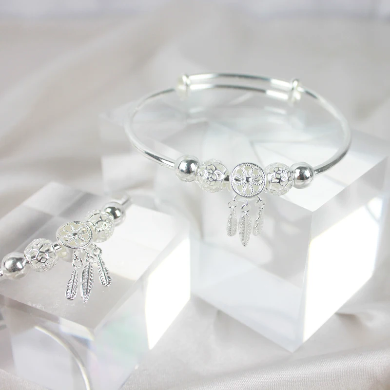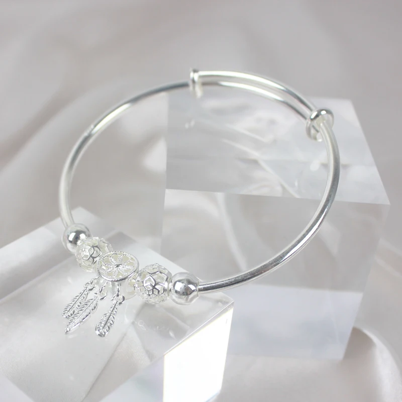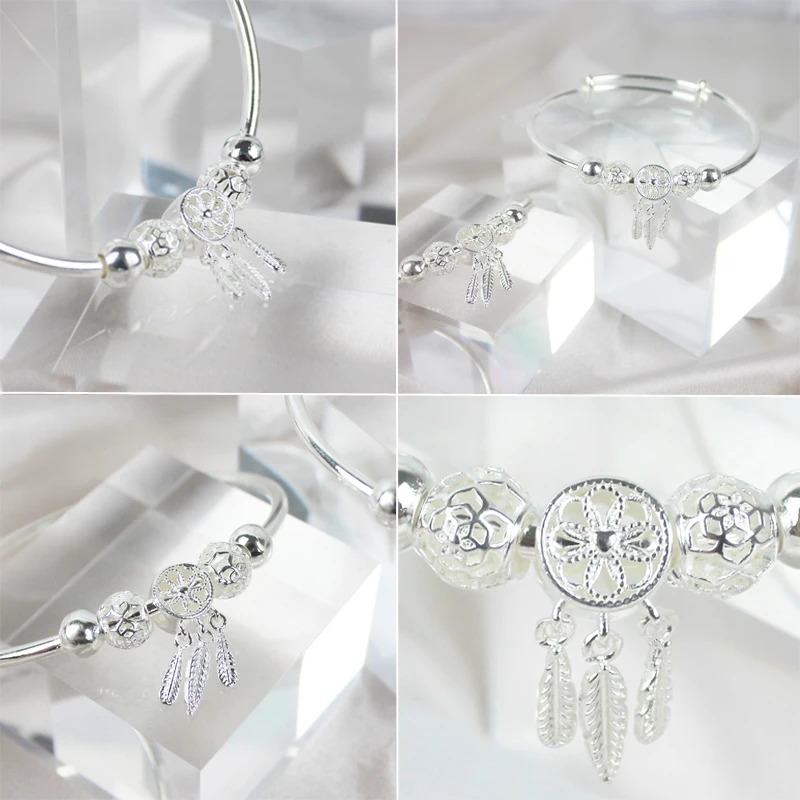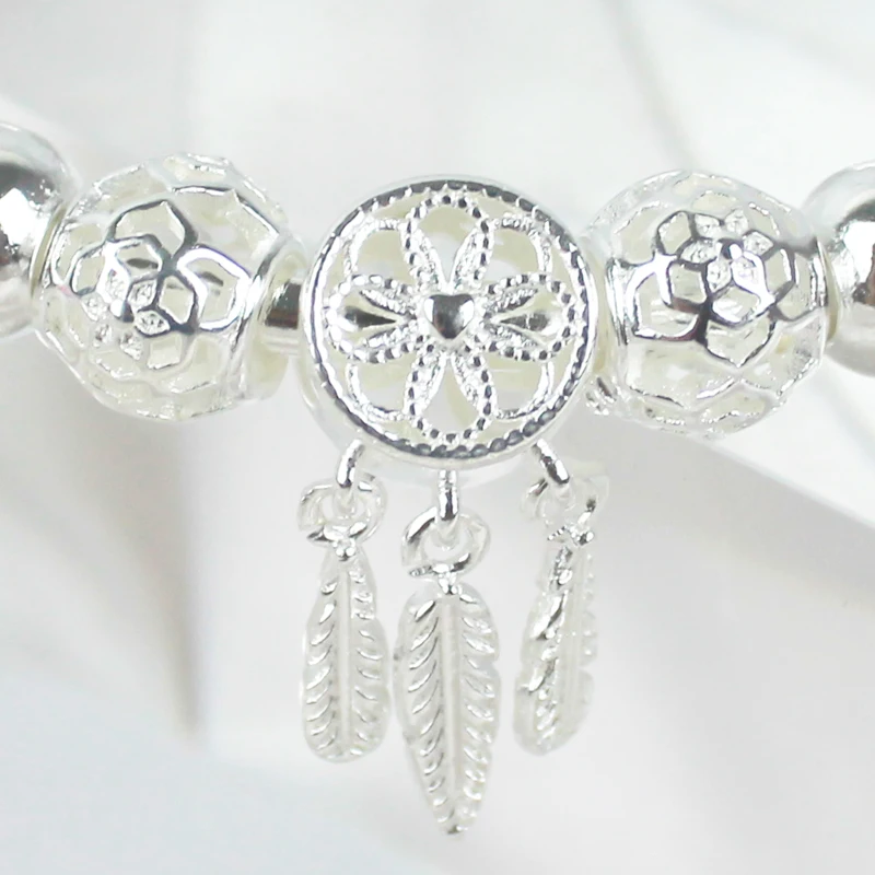 Регулируемое серебро 925 пробы, Ловец снов, кисточка, перо, Круглый браслет с бусинами и браслет для женщин, элегантные ювелирные изделия