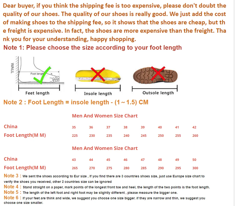 Уважаемый покупатель, если вы считаете, что стоимость доставки слишком высока, пожалуйста, не сомневайтесь в качестве нашей обуви. Качество нашей обуви действительно хорошее. Мы просто добавляем стоимость изготовления обуви к стоимости доставки, так что это показывает, что обувь дешевая, но стоимость перевозки дорогая. На самом деле, обувь дороже, чем стоимость перевозки. Спасибо за понимание, приятных покупок.
