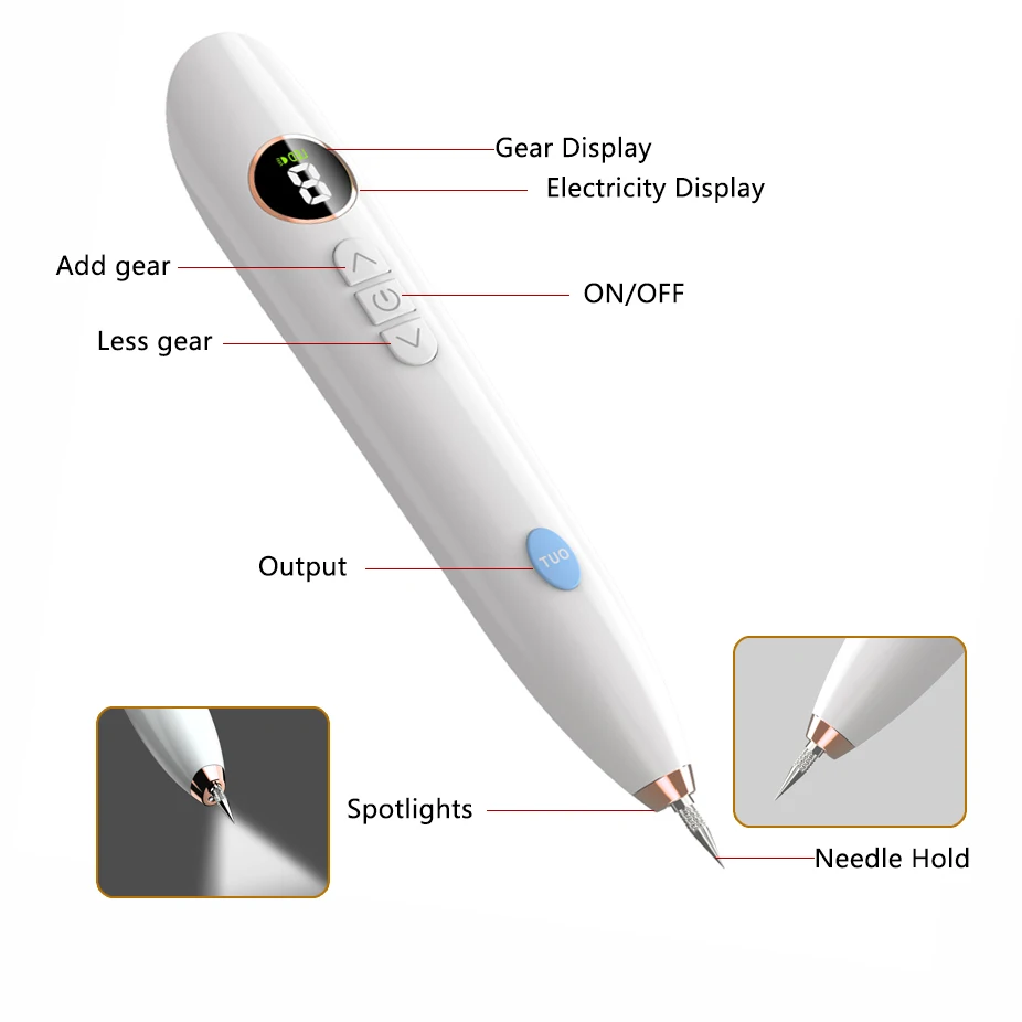 Эта ручка использует электрическое ионное лечение и управление микрокомпьютером toRemove геморроя, пятна, геморроя мяса, веснушки, обезьяны, бородавки, меланин точка, татуировка эффективным способом, без боли, без кровотечения, очень безопасно. Светильник очень приятный для использования.