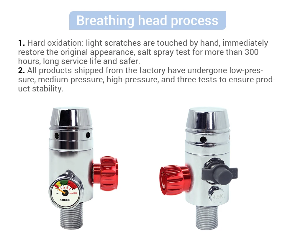 Резервуар для дайвинга изготовлен из авиационного алюминия 6061, поверхность имеет технологию распыления, хранение газа высокого давления, долговечность и устойчивость к коррозии морской воды. Интегрированный отпускной клапан имеет высокую точность и высокую стабильность, три слоя фильтрации могут эффективно защитить сердечник клапана, может эффективно организовать пыль и примеси для вдыхания. Тест-спрей для дыхательной головки в течение более 300 часов, длительный срок службы и безопасность.