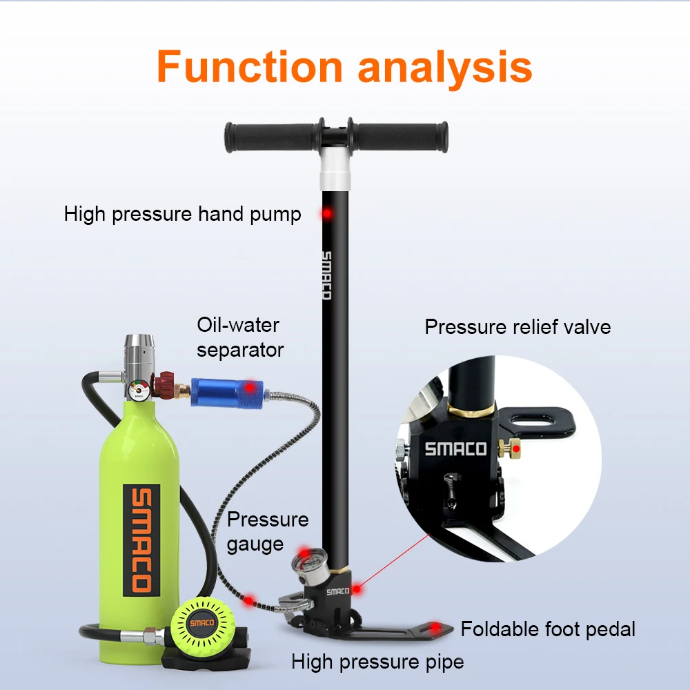 С адаптером для заправки больших флаконов, заполняйте до 8 секунд. В то же время, наша оригинальная Портативная сумка-мессенджер была заменена на портативную поясную сумку, чтобы вы могли легко носить ее с собой и освободить руки, чтобы сделать больше вещей под водой. Манометр прилагается, он изготовлен из нержавеющей стали и является водонепроницаемым, коррозионно-стойким и твердым. Он также имеет функцию подсветки, так что вы можете легко узнать, когда заполнить.