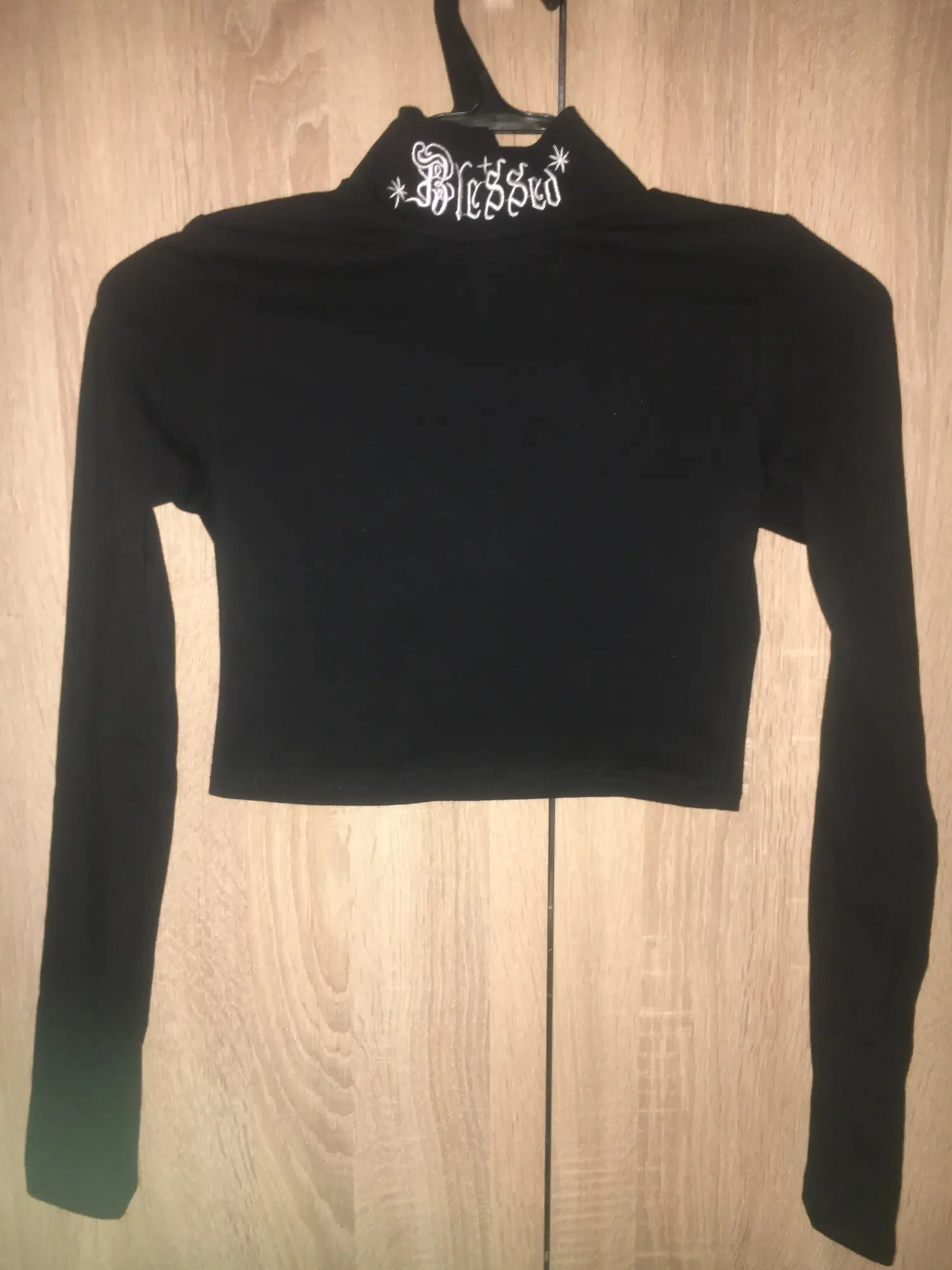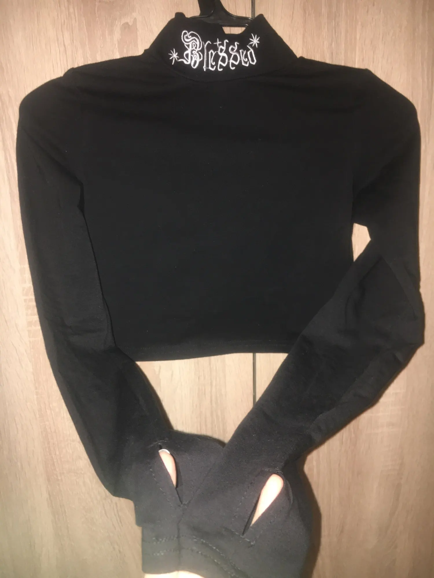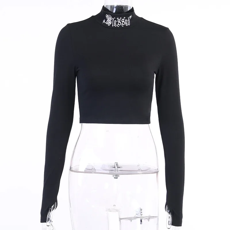 Женские черные облегающие укороченные топы с длинным рукавом, винтажные однотонные топы с вышивкой надписью, Женские Повседневные базовые Топы