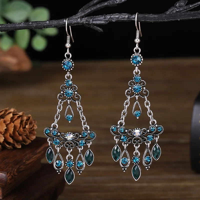 Женские серьги Бохо с синими кристаллами, винтажные этнические длинные стразы, полые женские серьги-подвески, ювелирные изделия для рождественской вечеринкиЦвет: синийПовод: вечерние, свадебные, дни рождения, праздникиКостюм для: женщин, девочек, женщинМатериал: сплав + стразы + хрусталь
