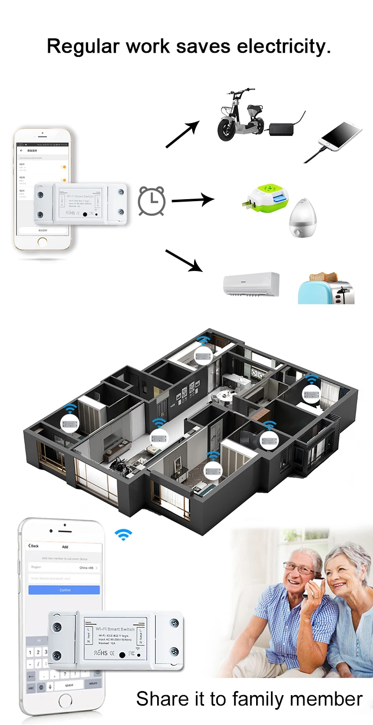 4. Совместно используемое устройство: Этот переключатель samrt может иметь несколько контрольных участков, которыми управляют члены семьи. Один мобильный телефон также может управлять многими переключателями.