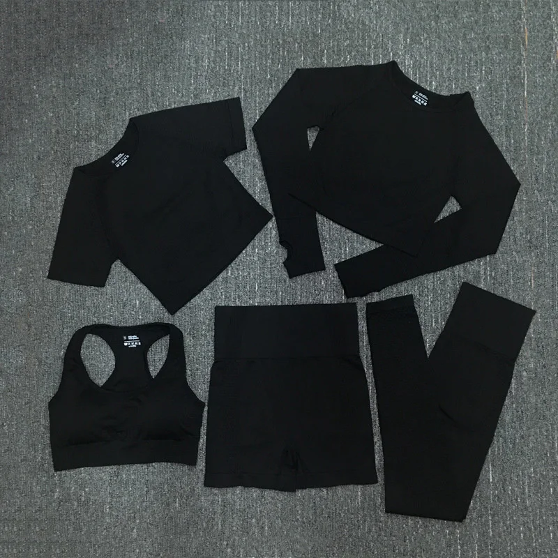 Женские комплекты для йоги, женские спортивные костюмы для фитнеса, тренажерного зала, одежда для бега, бесшовные леггинсы, короткий топ с длинным рукавом, спортивный бюстгальтер
