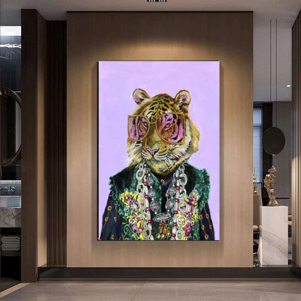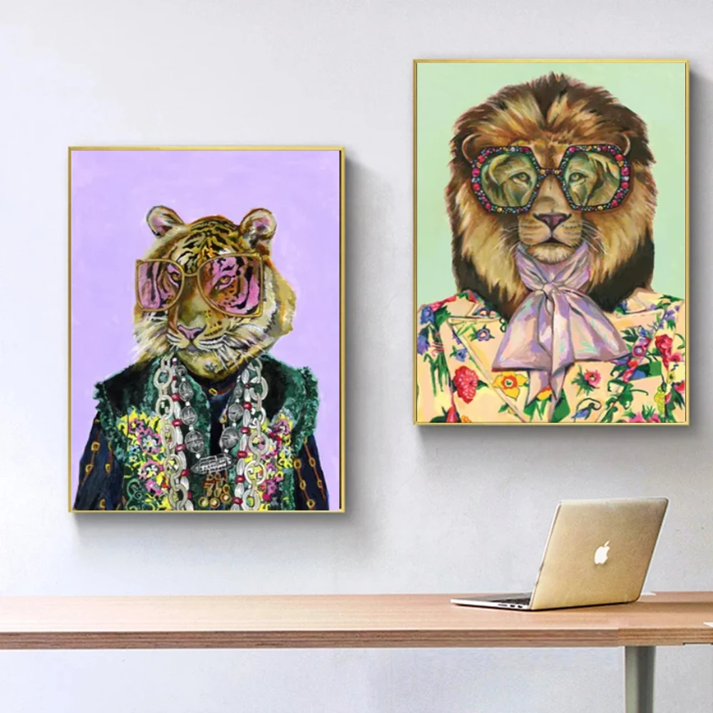 Роскошные постеры с изображением Льва в костюме с очками и золотой цепочкой, картины на холсте и принты, современные картины с животными, декор для спальни