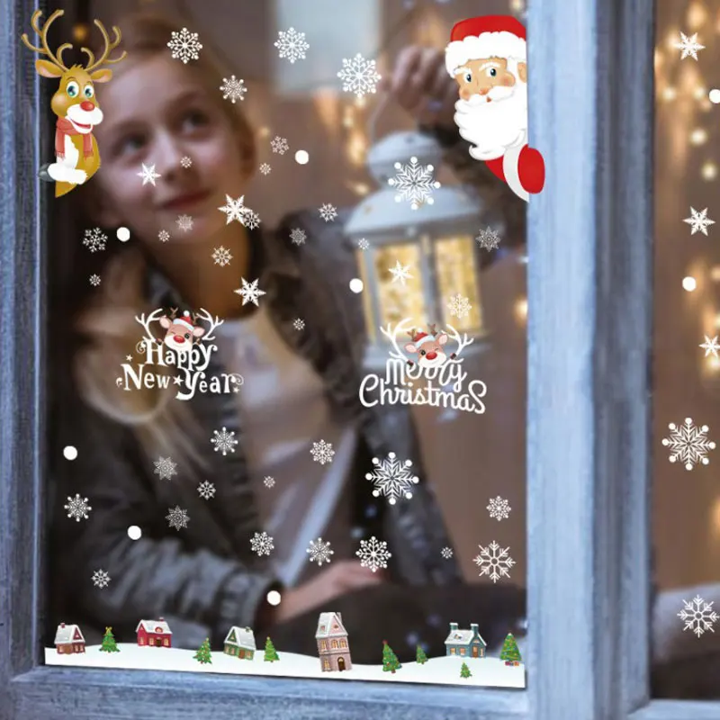 Рождественская мультяшная Наклейка на окно с Санта-Клаусом, оленем, снежинка, Электростатическая наклейка для окон, цветная Электростатическая декоративная наклейка