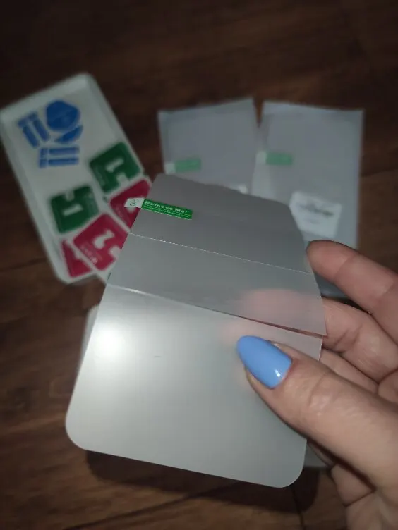 4 защитные гидрогелевые пленки, 4 пары салфеток и скребок для удаления воздуха и склеивания. Пока я наклеил пленку на экран, я почти лег от ворса и пыльцы, прилипающей к экрану. Это требует практики. В общем, пленка крутая, если бы не пузырьки, то не было заметного присутствия, тонкая.