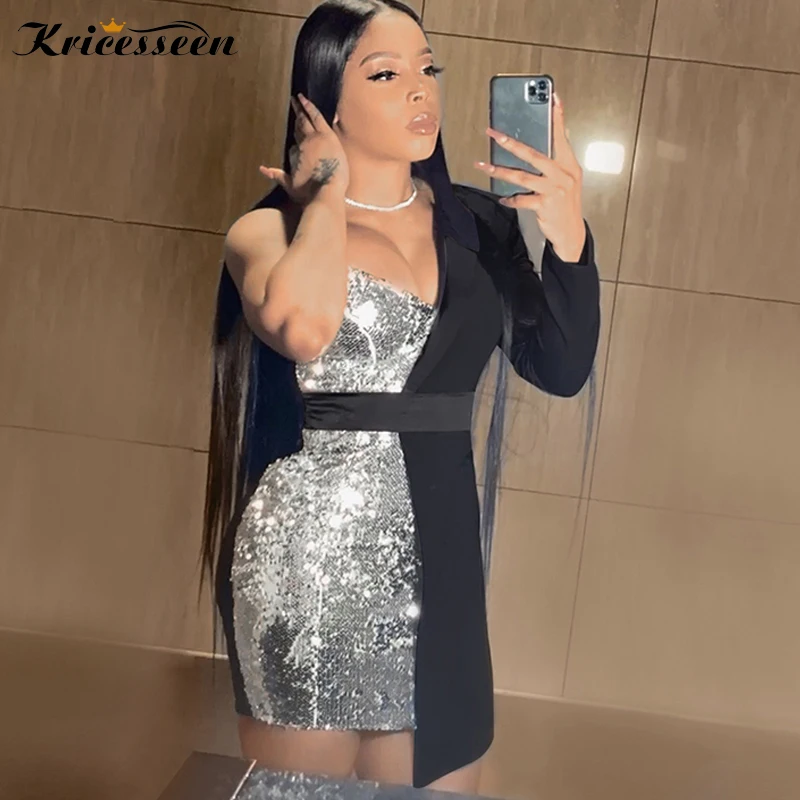 Kricesseen пикантное лоскутное мини-платье с блестками осенние женские платья на одно плечо с блестками для дня рождения Клубная одежда облегающая