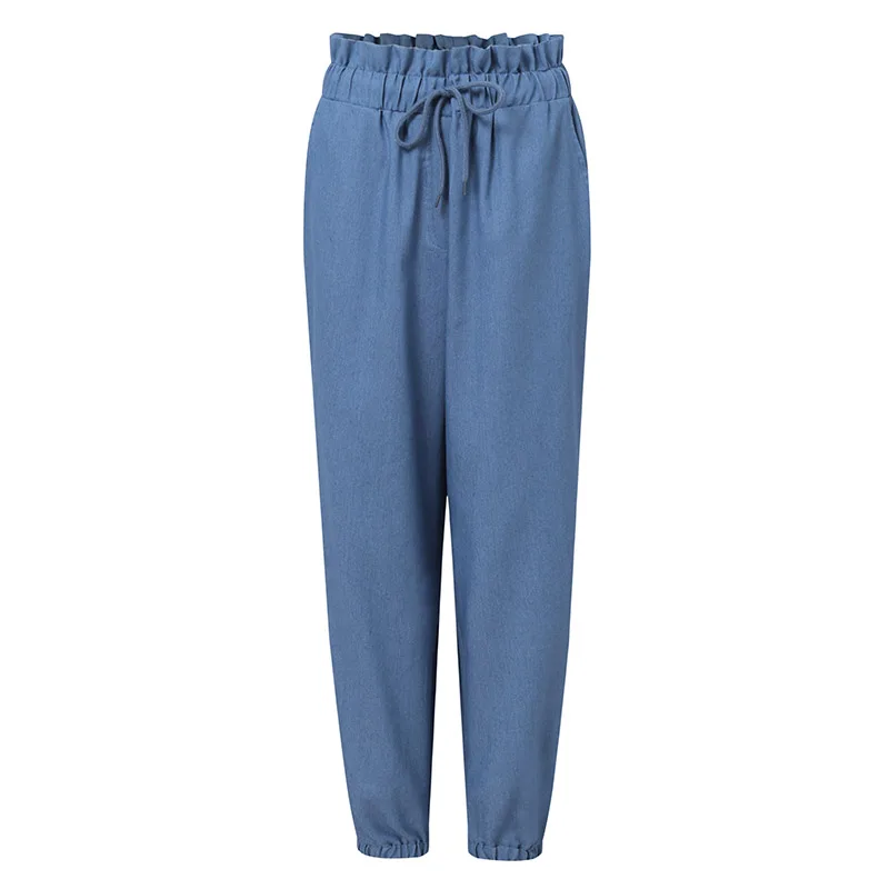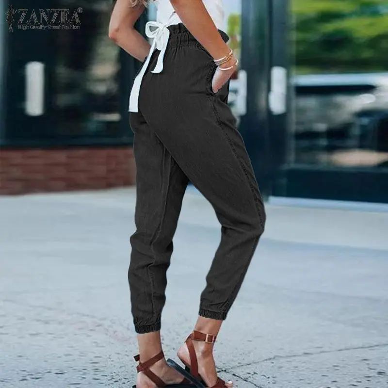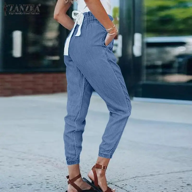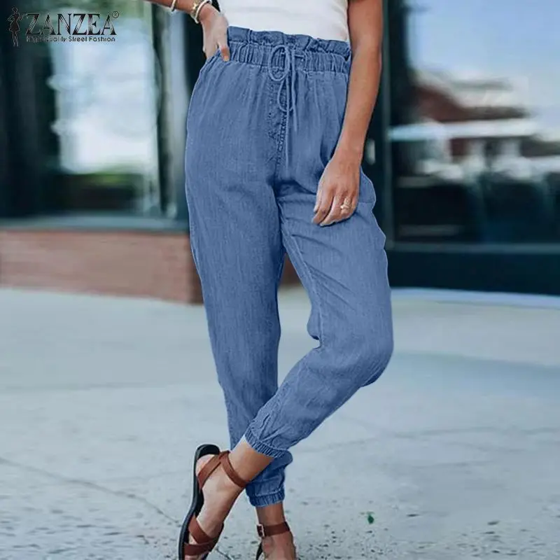 Женские джинсовые брюки, Осенние однотонные длинные брюки-карандаш с эластичным поясом, модель ZANZEA 2021 года, модные повседневные брюки палаццо с резьбой, большие размеры